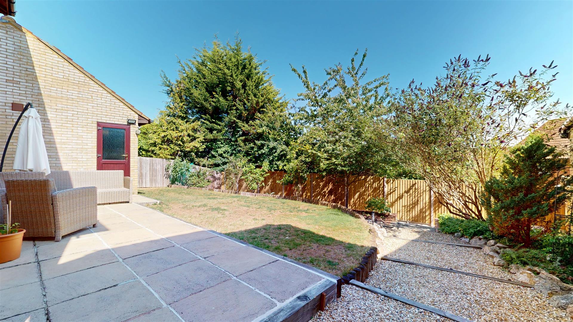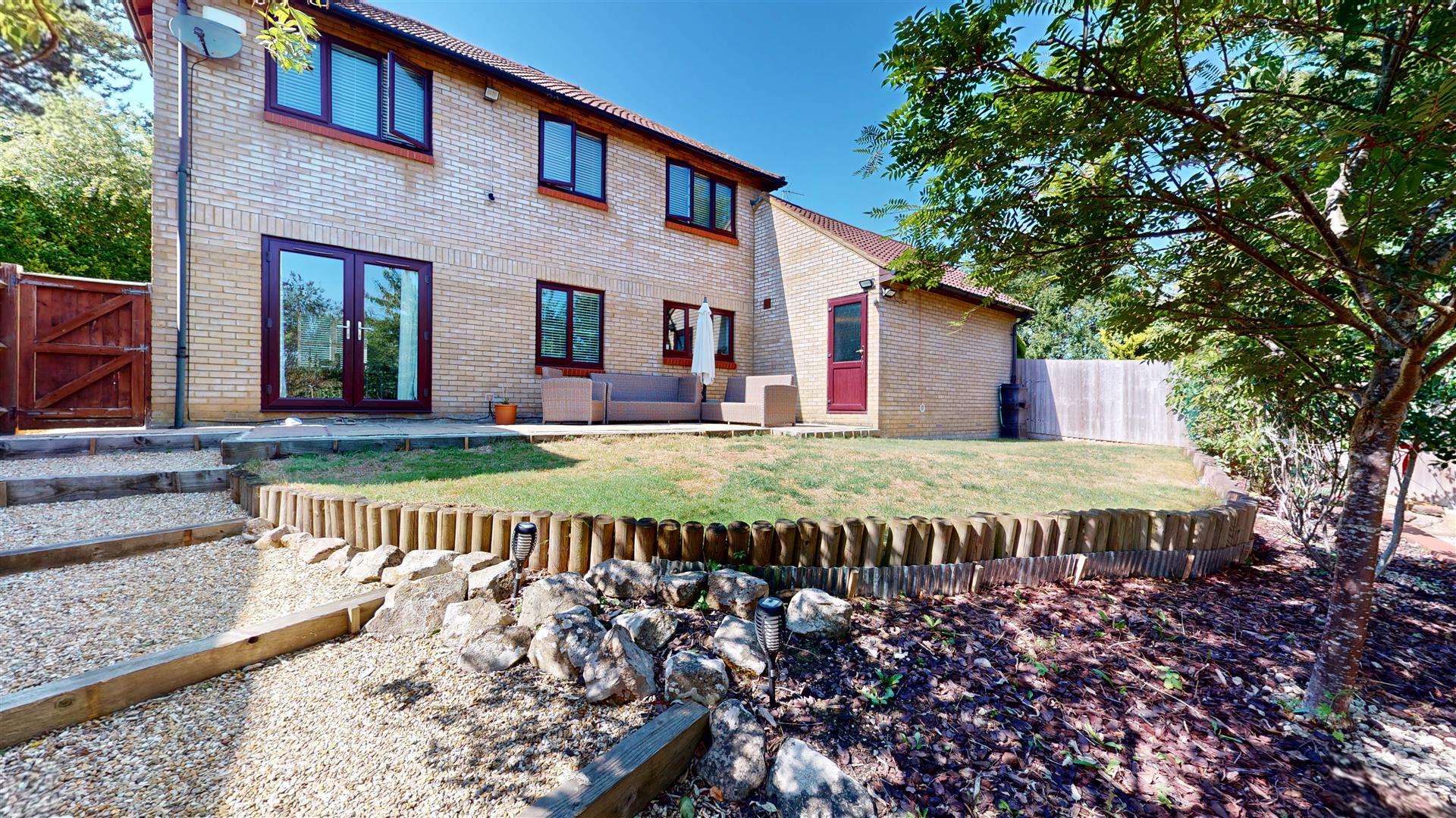 Private southerly facing landscaped tiered rear garden, laid mainly to lawn with brick and wooden fence surround. Gated side access. Service door to garage.