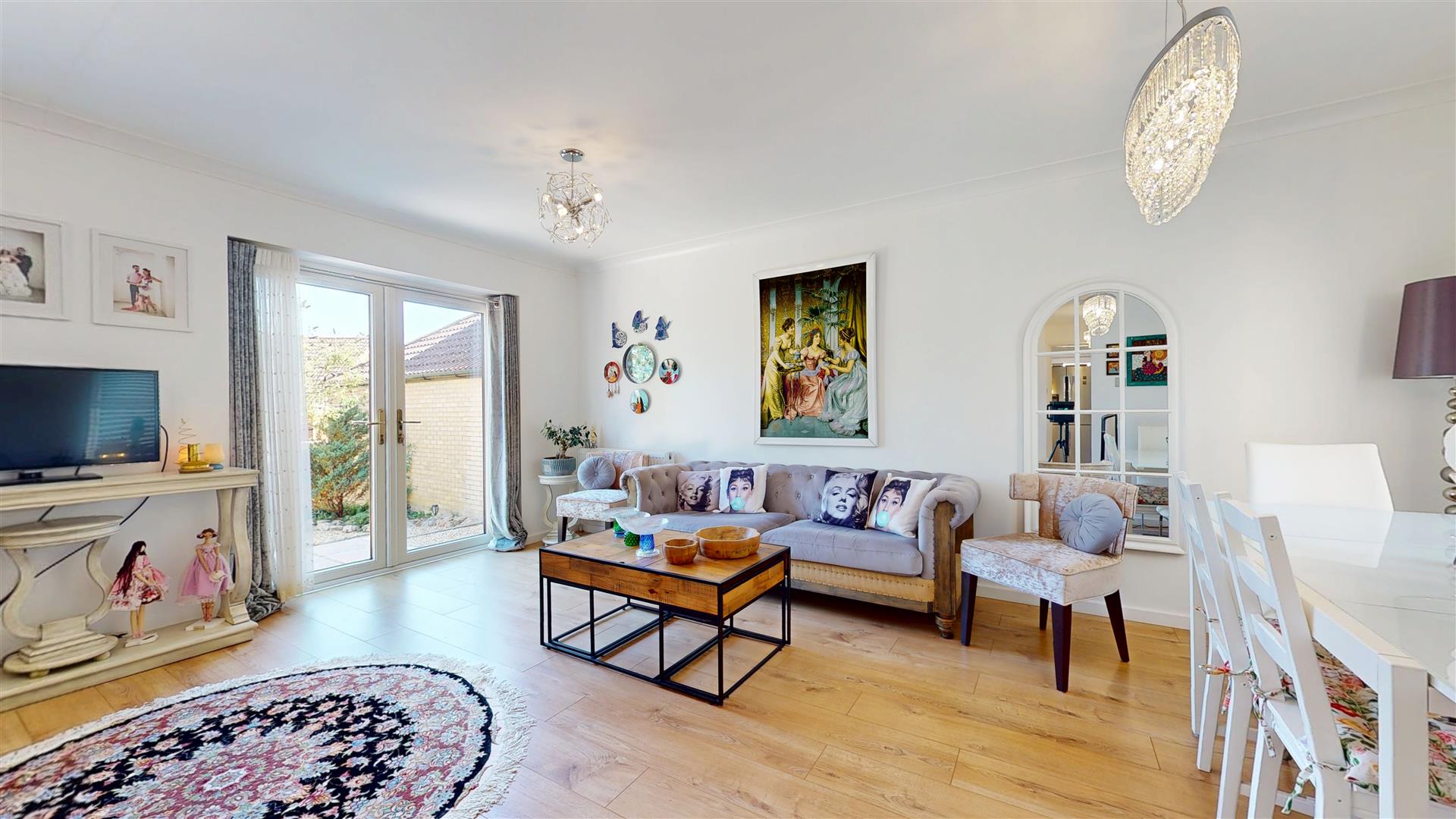 Dual aspect room with double glazed window to front and rear. Double glazed French doors to rear. Three radiators. Coving to skimmed ceiling. Door to cloakroom.