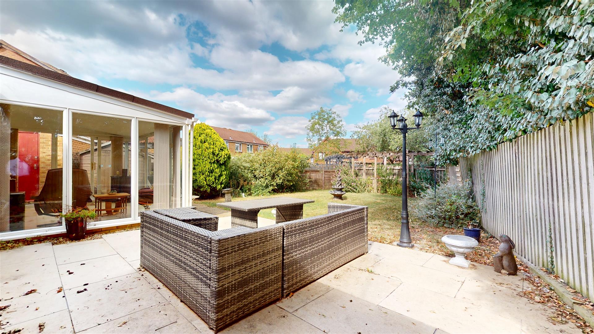 Enclosed and laid to lawn with patio area. Gated sided access. Garden shed. Door to single garage.