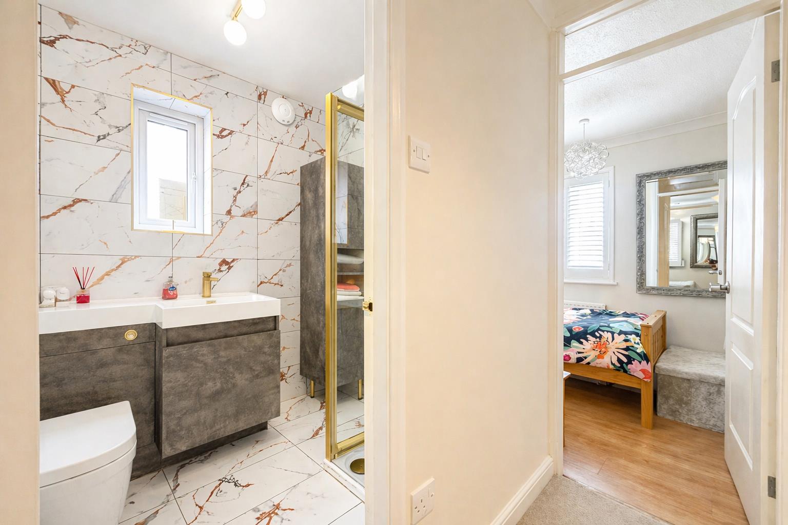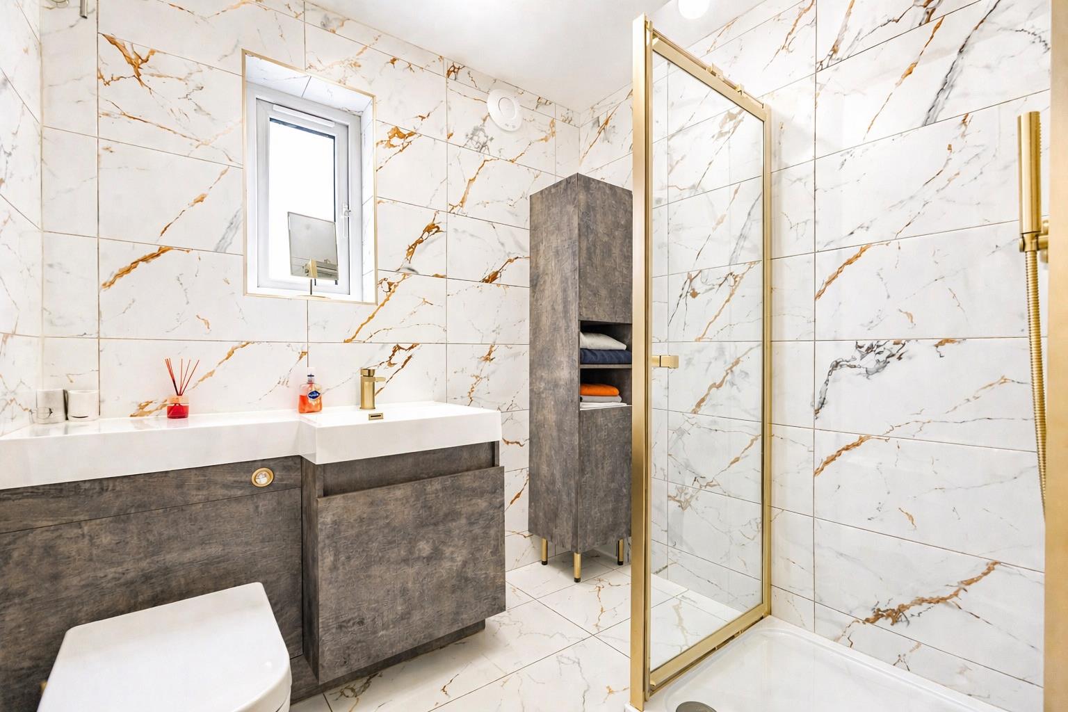Re-fitted three piece suite comprising tiled shower cubicle with wall mounted shower, low level wc and wash hand basin in vanity surround. Tiled walls and flooring. Heated towel rail. Frosted double glazed window to side.