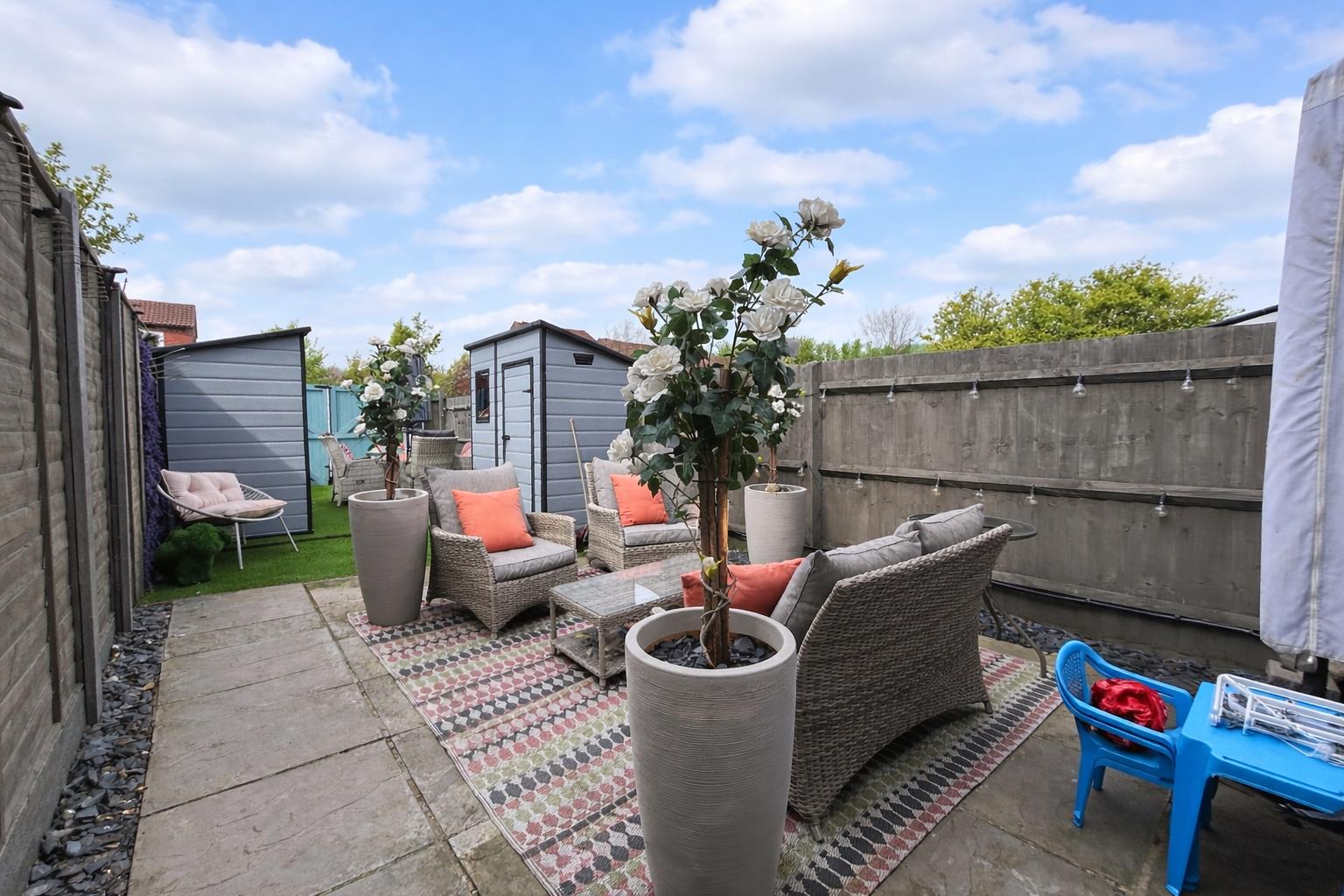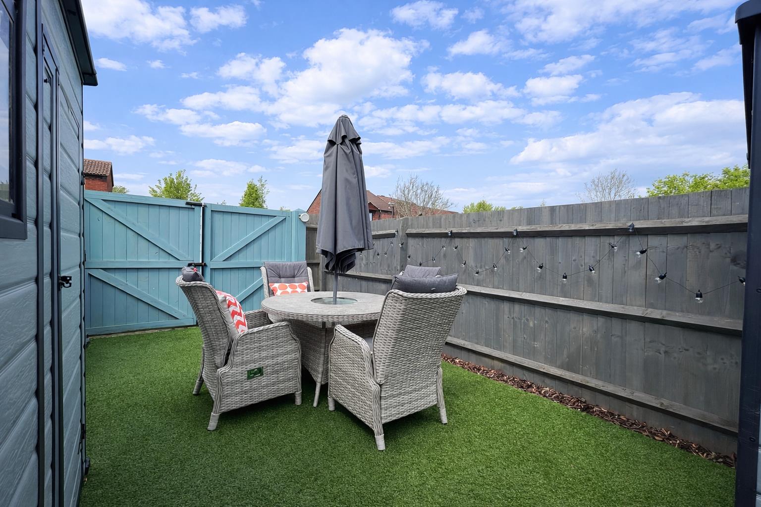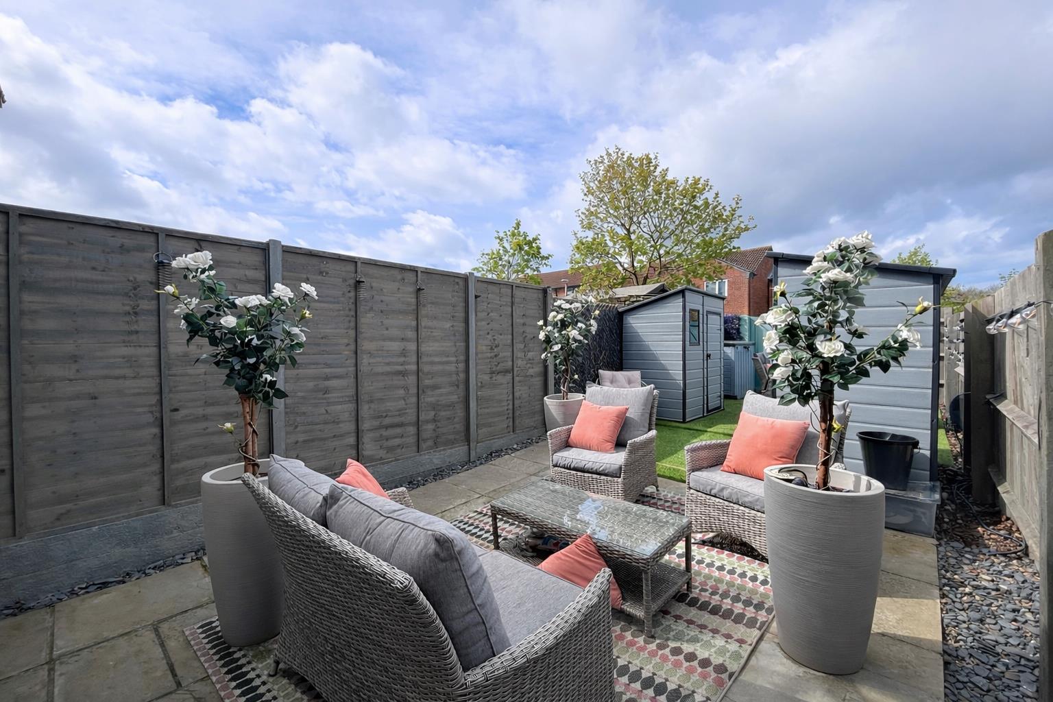 Enclosed rear garden, laid mainly to lawn with patio and shingle area. Driveway for two cars. Outside shed with power. Gated rear access.