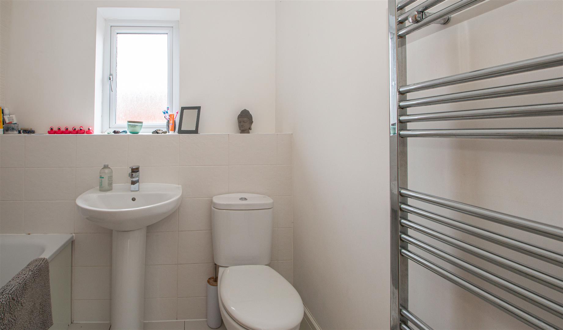 Three piece suite comprising panelled bath with shower attachment, low level wc and wash hand basin. Part tiled walls. Heated towel rail. Tiled flooring. Frosted double glazed window to front. Skimmed ceiling Inset lighting. Extractor.