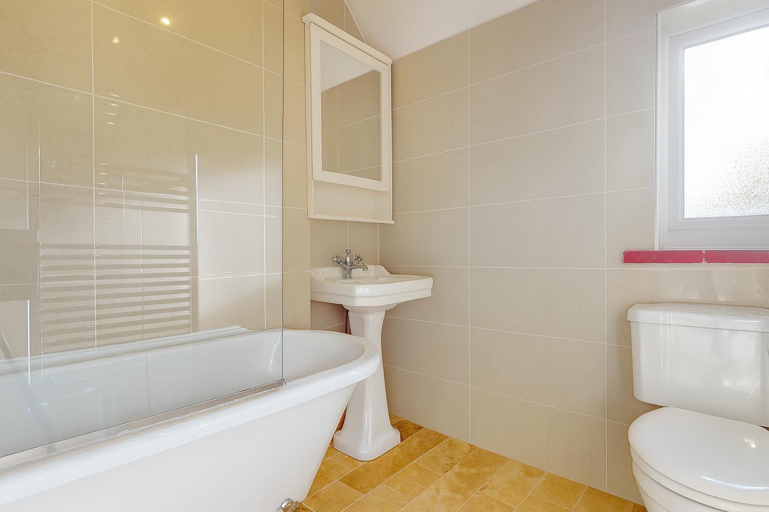 Re-fitted suite comprising freestanding bath with shower attachment,. low level wc and wash hand basin. Hardwood tiled flooring Frosted double glazed window to rear. Skimmed ceiling. Towel rail.