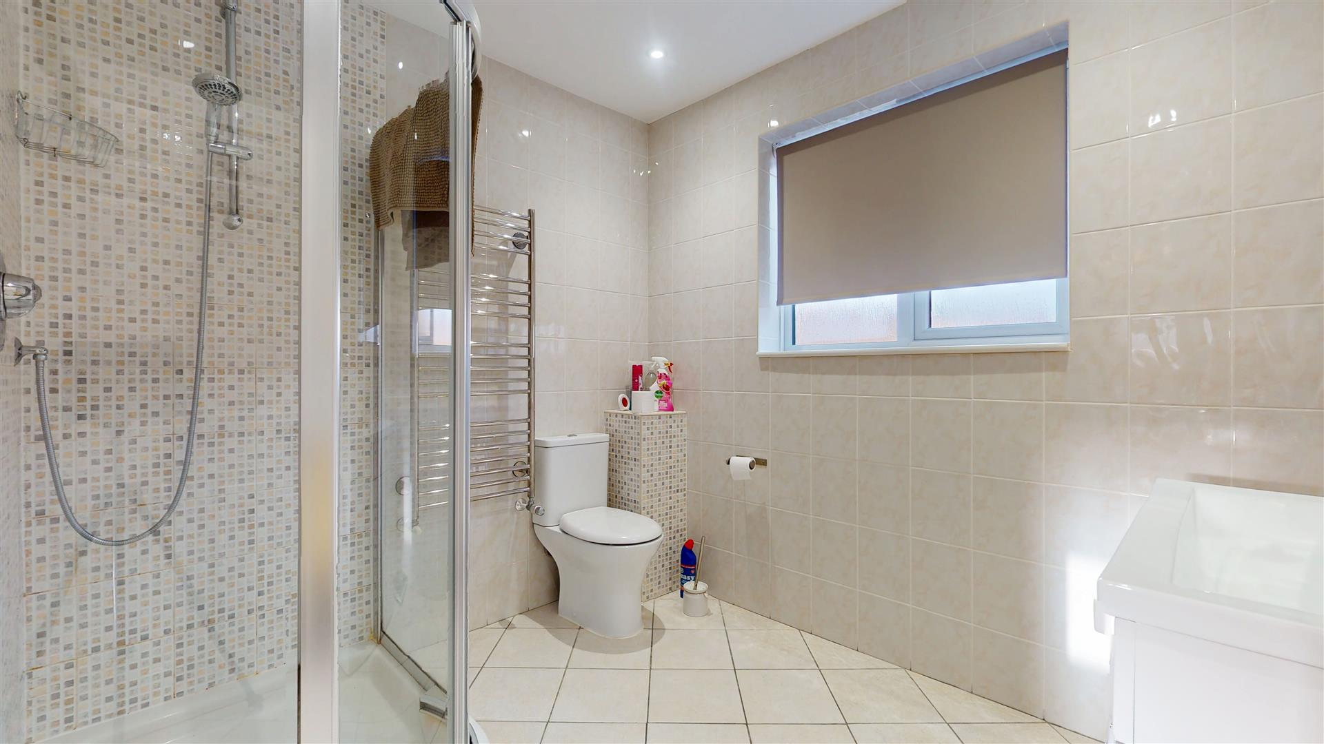 Three piece suite comprising double tiled shower cubicle with wall mounted shower, low level wc and wash hand basin. Heated towel rail. Frosted double glazed window to front. Tiled walls and flooring.