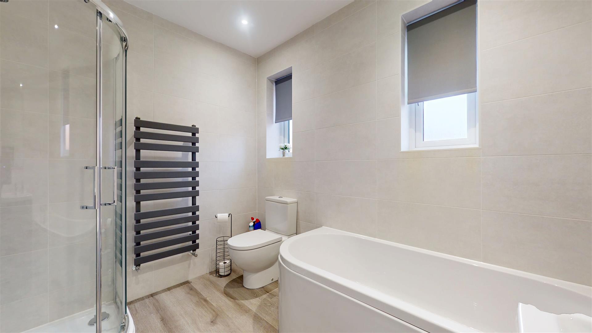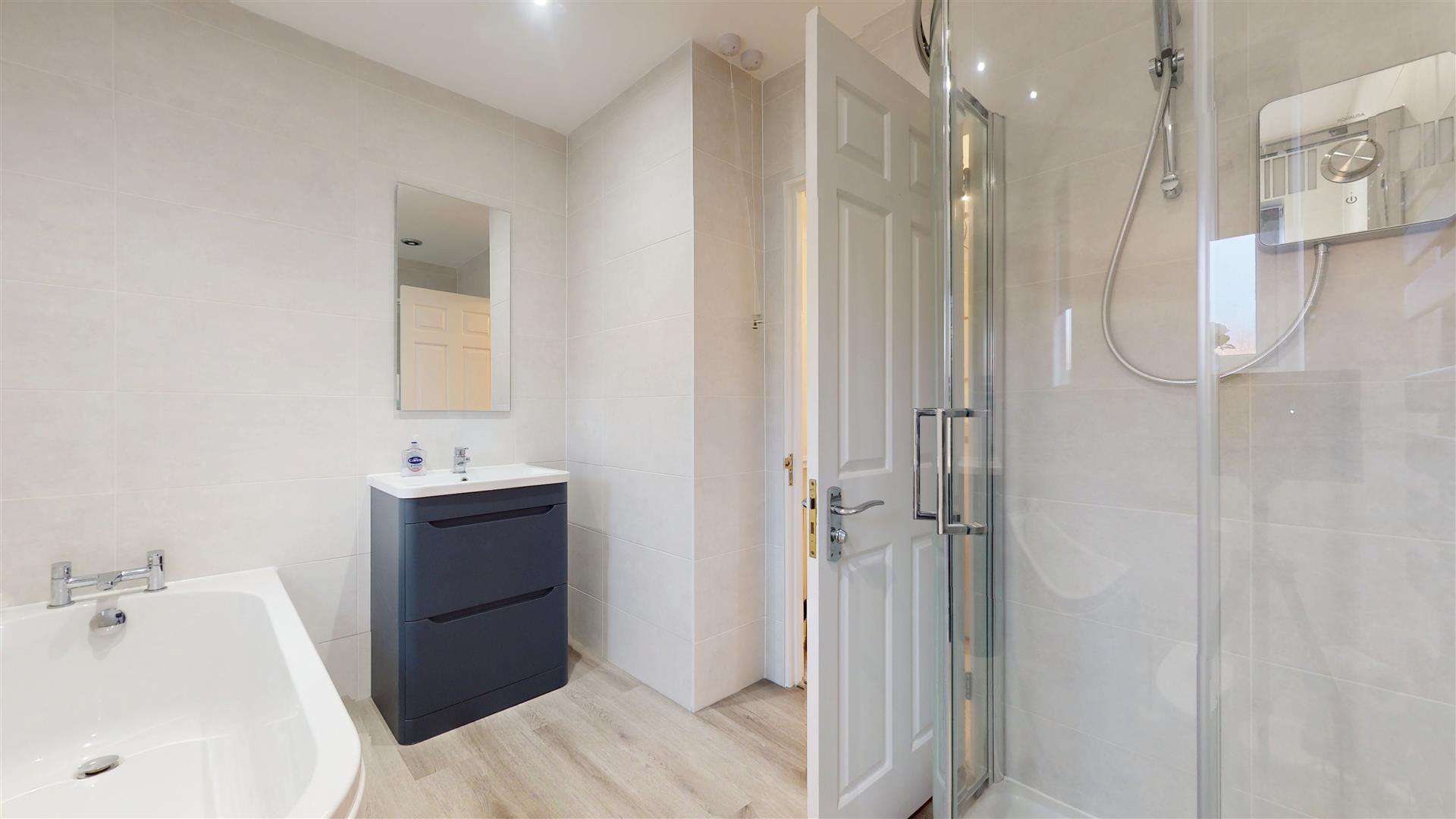 Re-fitted four piece suite comprising panelled bath, tiled shower cubicle with wall mounted shower, low level wc and wash hand basin with drawer surround. Feature towel rail. Skimmed ceiling. Inset lighting. Two frosted double glazed windows to front.
