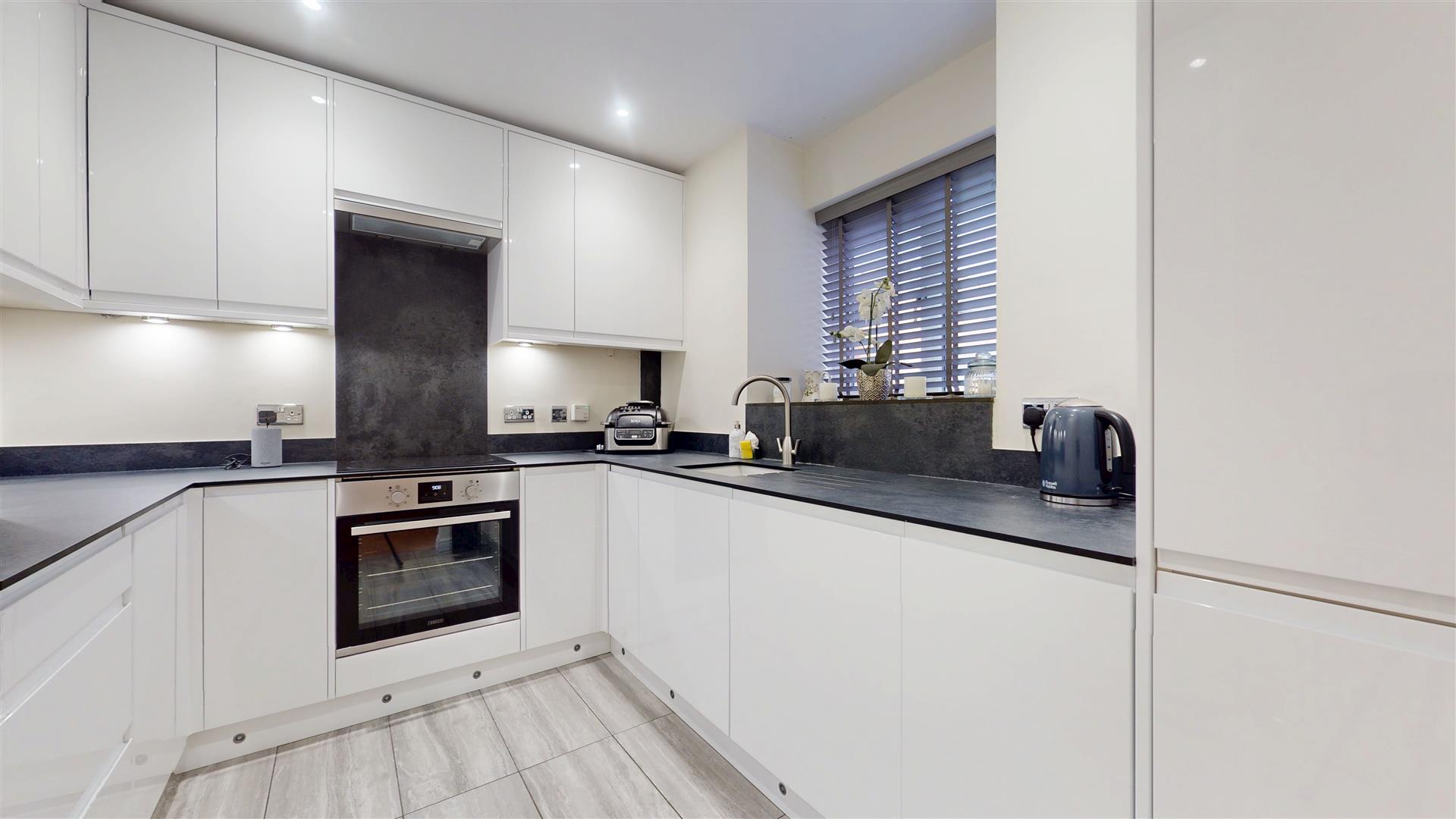 Re-fitted with a range of wall and base units with worksurfaces incorporating sink drainer and mixer tap. Built in fridge freezer and dishwasher. Double glazed window to front. Under unit lighting. Built in oven, four ring induction hob and extractor hood. Skimmed ceiling with inset lighting.