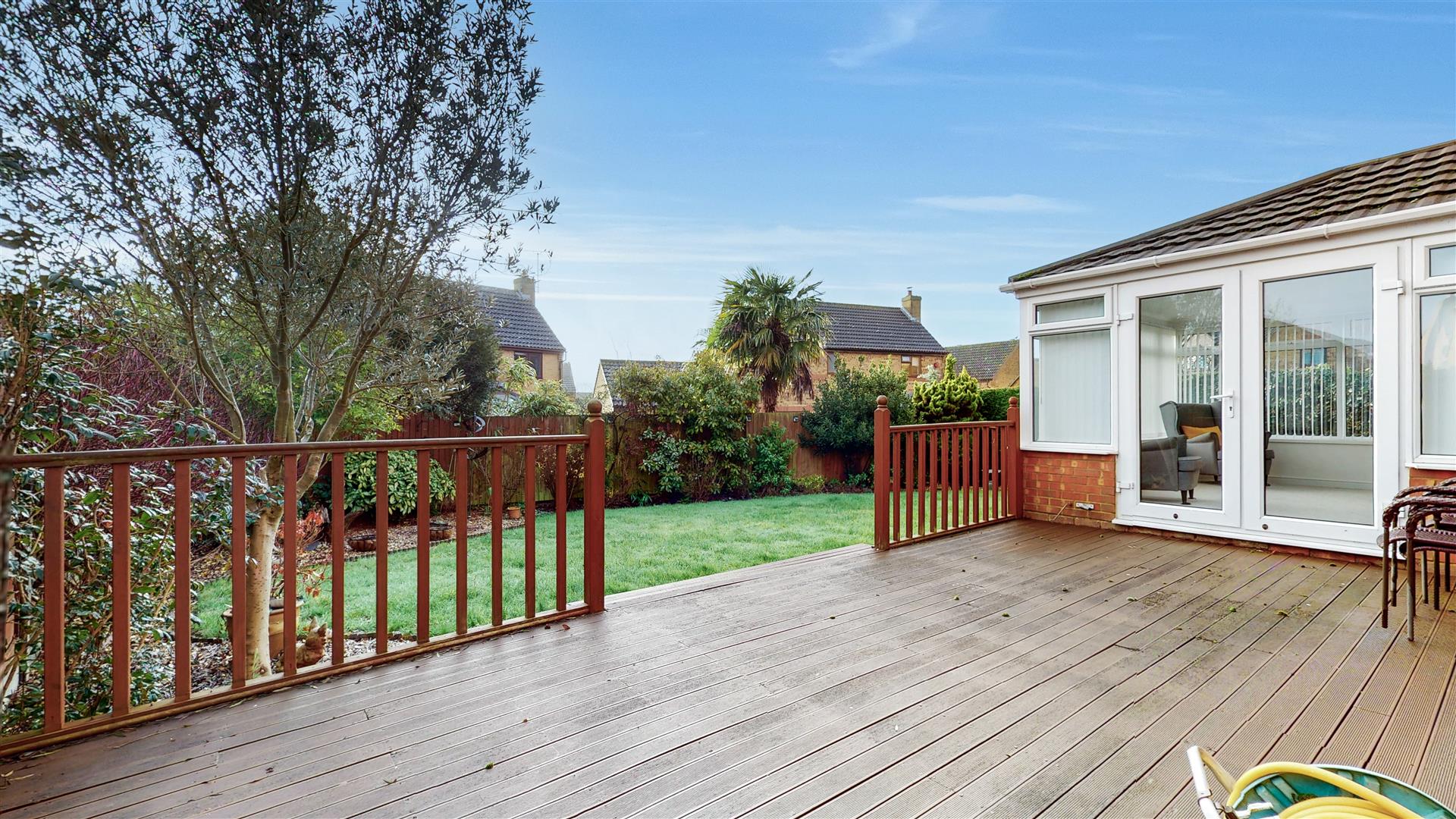 Enclosed rear garden, laid mainly to lawn with decking area. Wooden fence and hedgerow surround. Gated side access. Mature tree, flower and shrub borders.