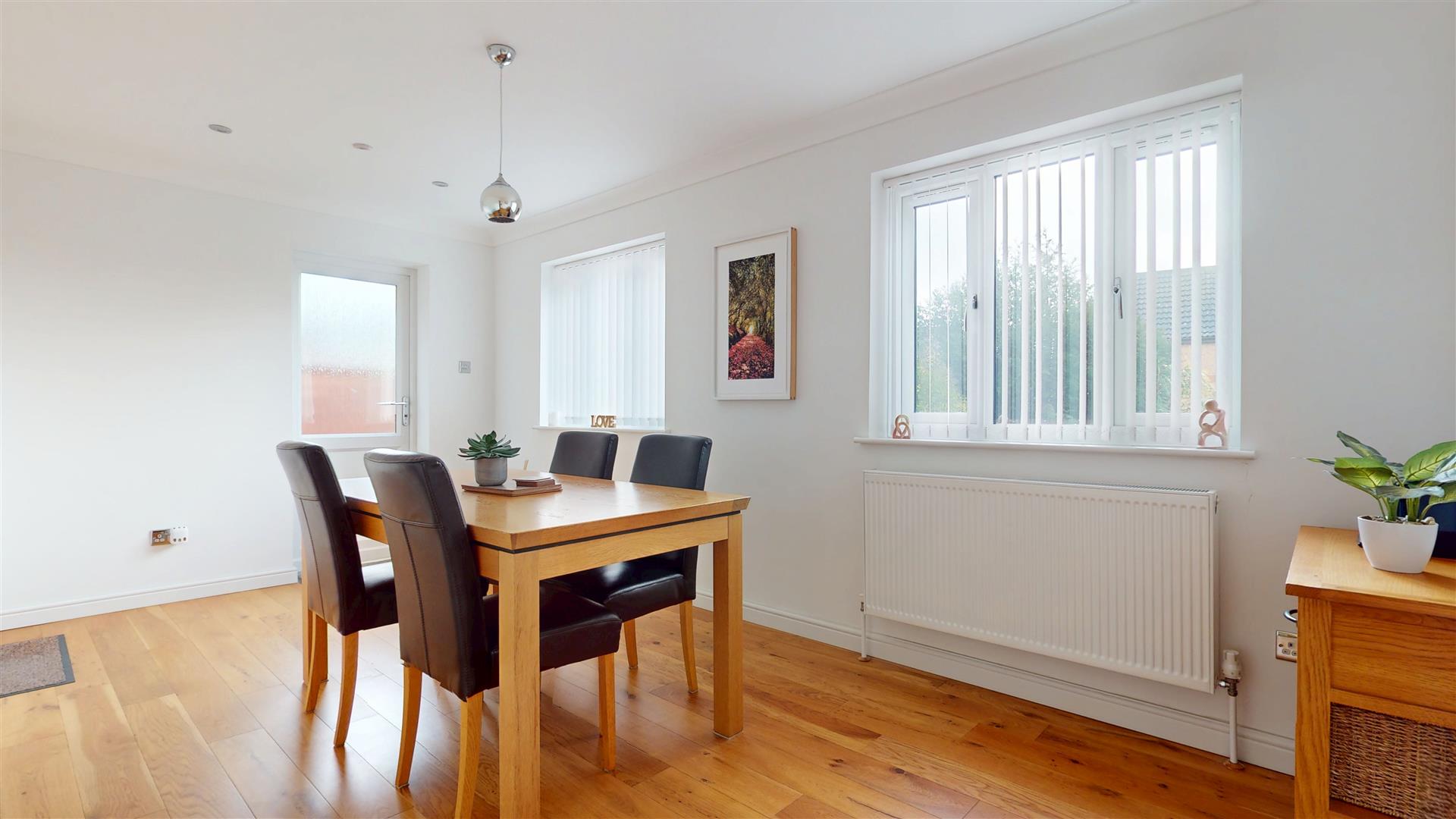 Two double glazed windows to rear. Radiator. Double glazed door to rear garden. Coving to skimmed ceiling. Inset lighting. Door to garage.