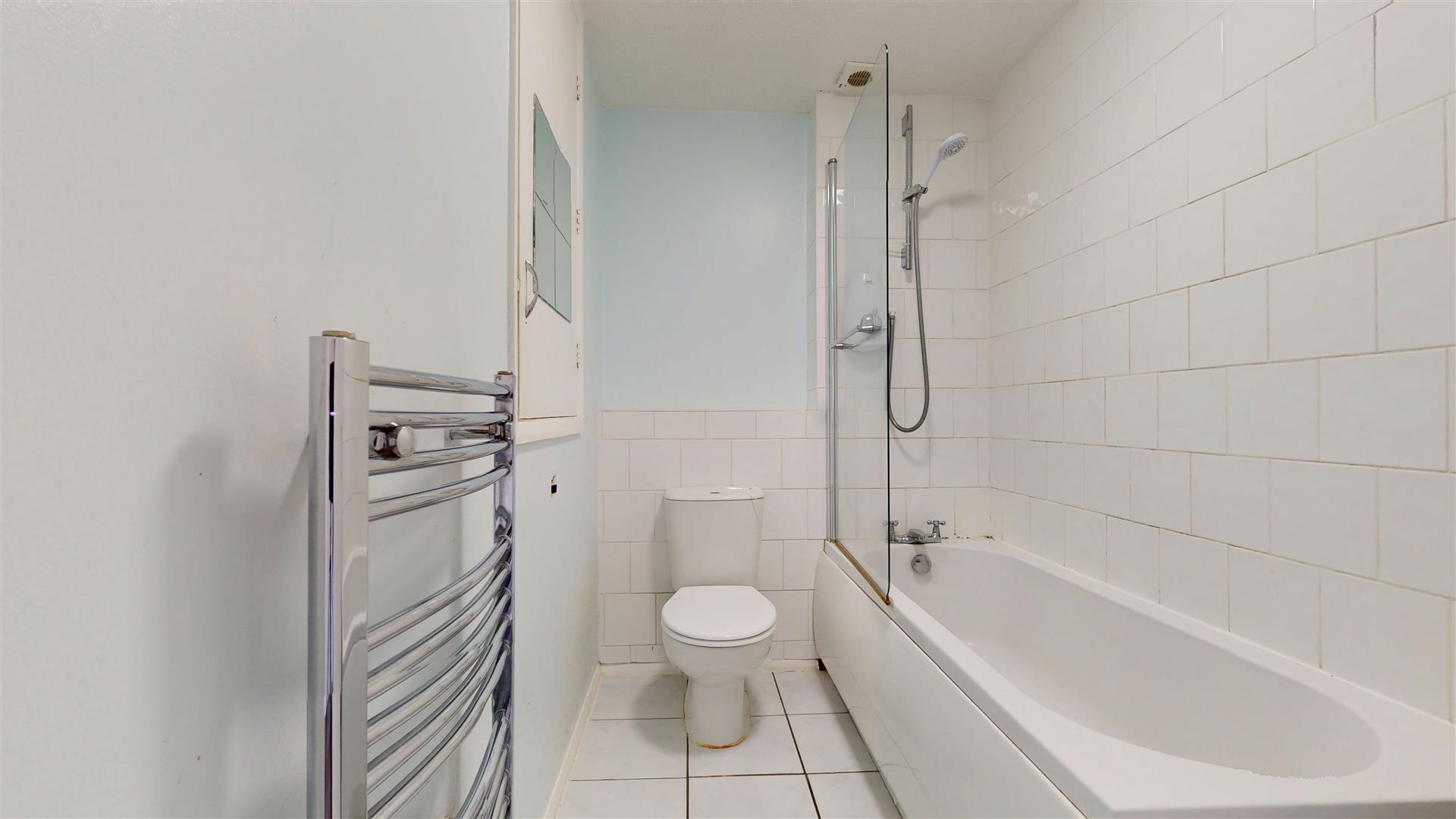 Three piece suite comprising bath with electric shower, wash hand basin and close coupled wc. Heated towel rail. Extractor fan. Airing and storage cupboard. Tiled flooring. Part tiled walls.