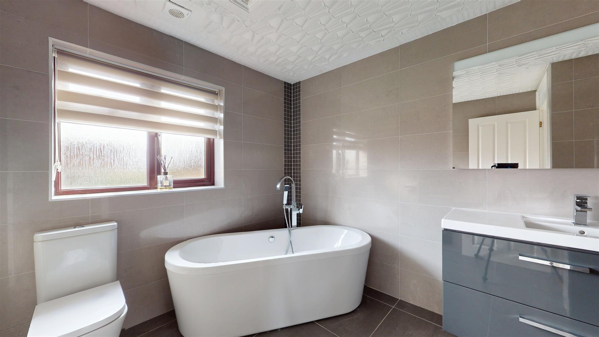Re-fitted four piece suite comprising freestanding bath, low level wc, wash hand basin in vanity surround and walk in tiled shower cubicle with wall mounted shower. Tiled walls and flooring. Frosted double glazed window to side. Loft access.