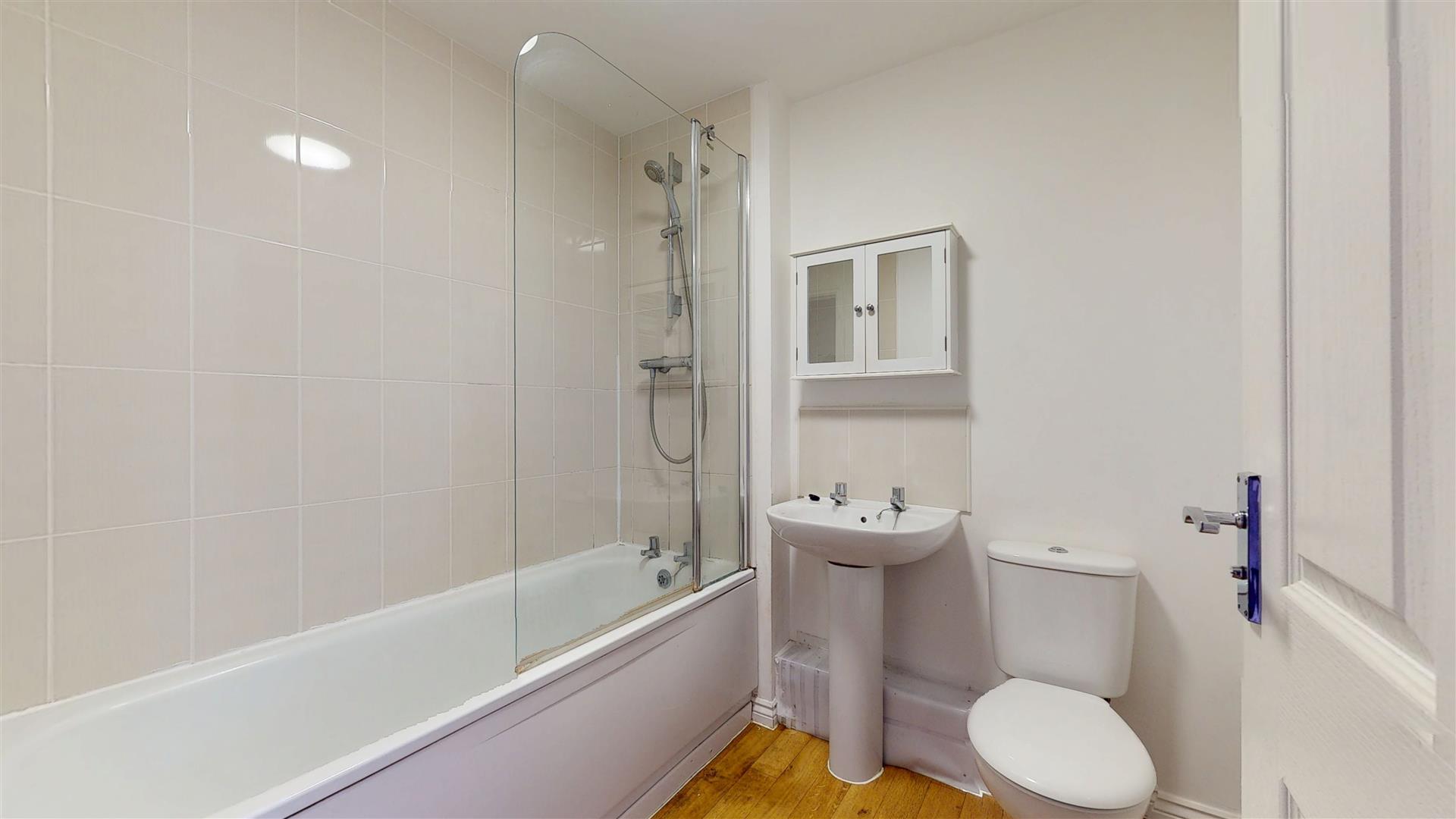 Three piece suite. Panelled bath with mixer tap and shower over. Low level wc, wash hand basin with mixer tap and splash back tile. Radiator. Skimmed ceiling.