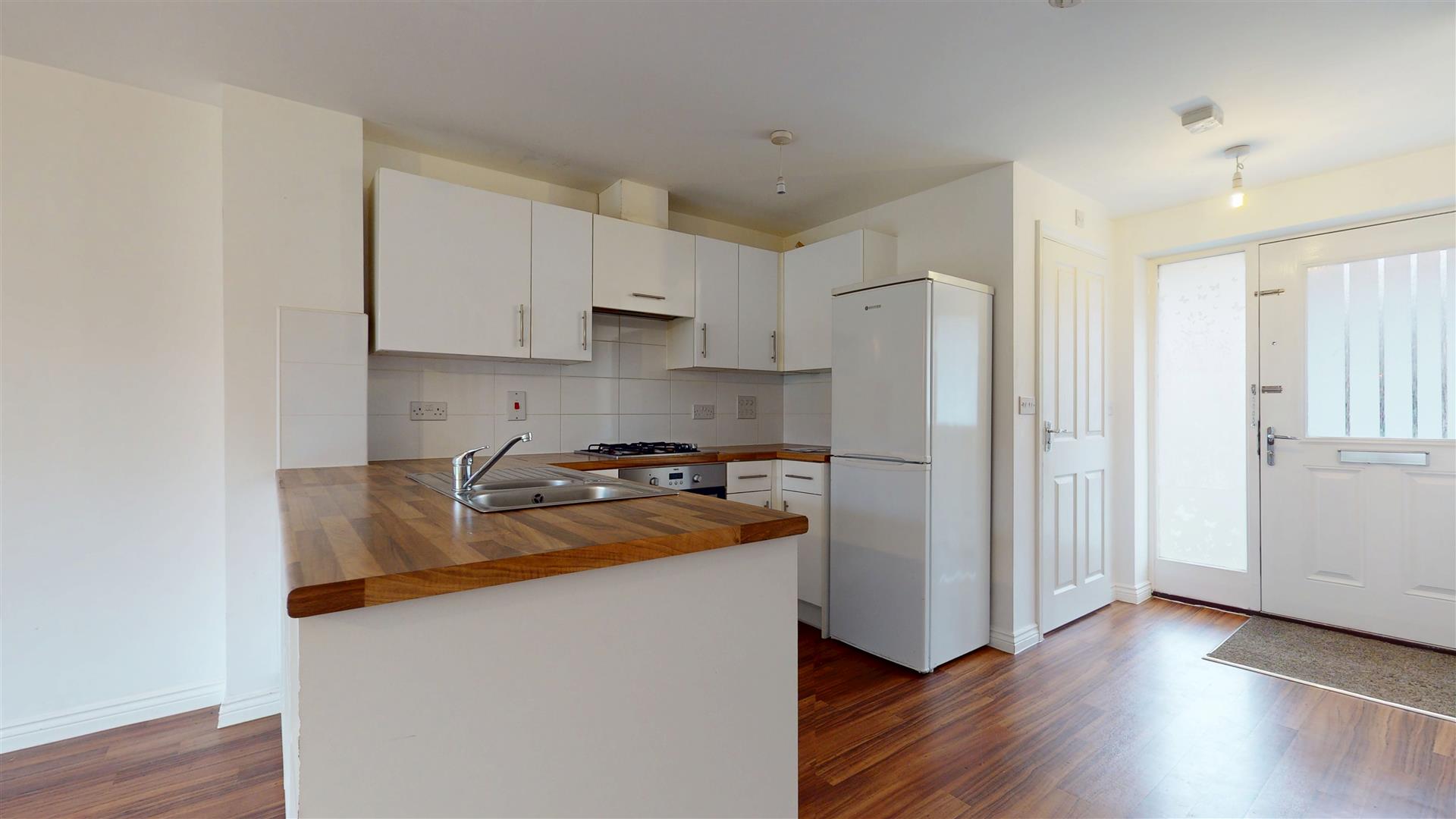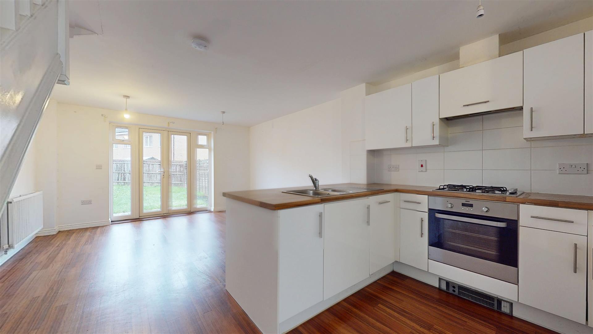 Measurements include stairs leading to first floor. Double glazed French door and double glazed windows to either side to the rear. Double panelled radiator. Kitchen area is fitted with a range of wall and base units. Work surfaces incorporating a one and a half sink and drainer with mixer tap. Built in oven, four ring hob with extractor over. Space for fridge freezer. built in dishwasher. Double door cupboard houses with plumbing for washing machine. Splash back tiles. Extractor.