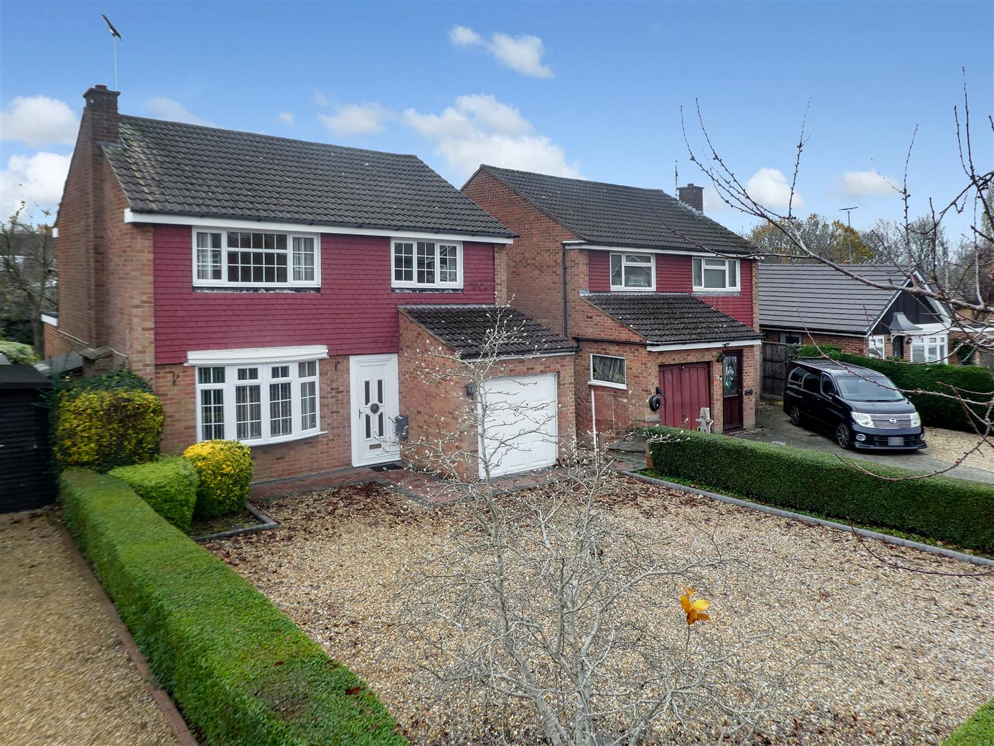 Hedge border and raised flower beds with off road parking for several vehicles.