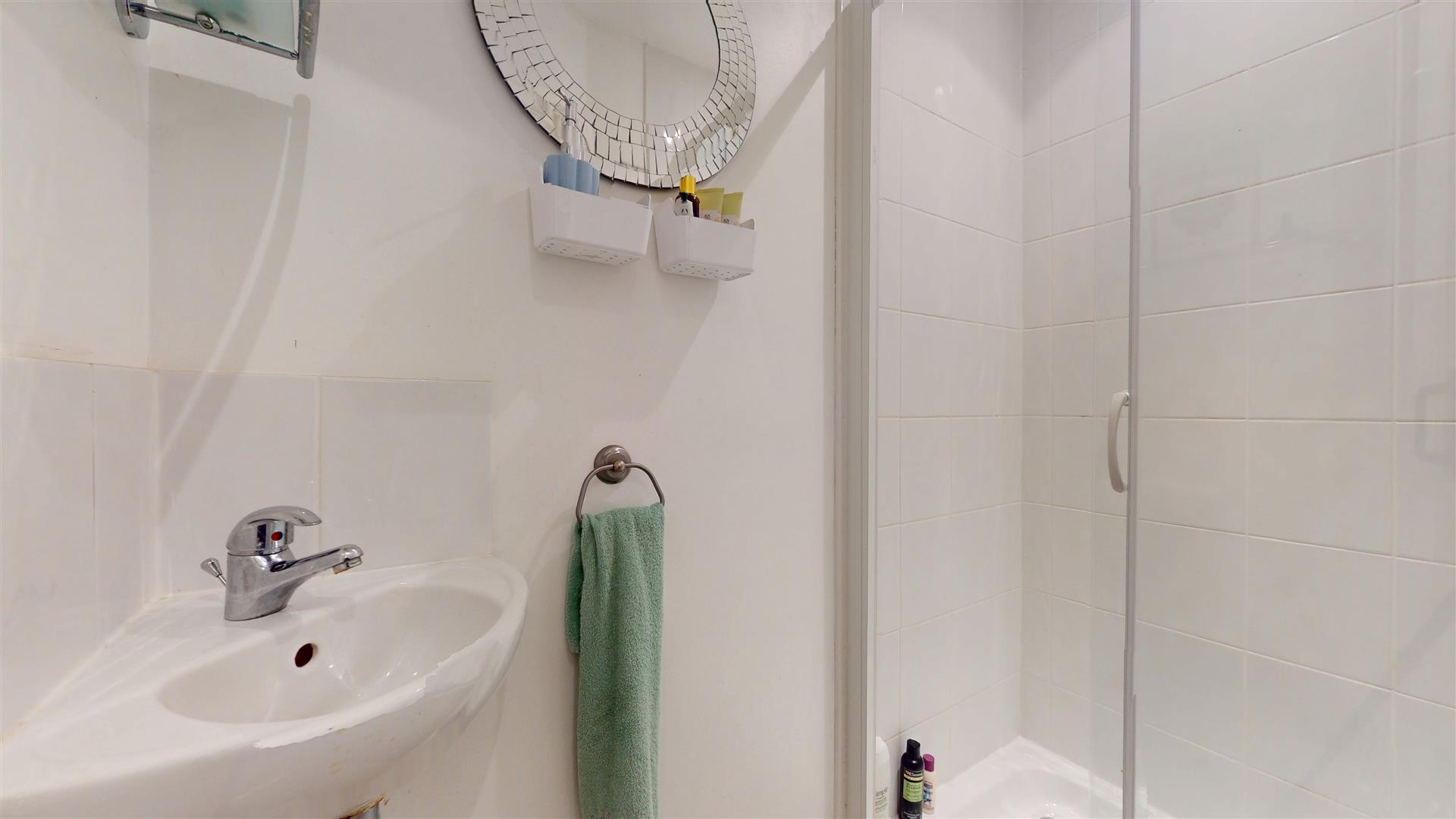 Shower cubicle with mains shower. Wash hand basin. Extractor fan. Tiled floor.