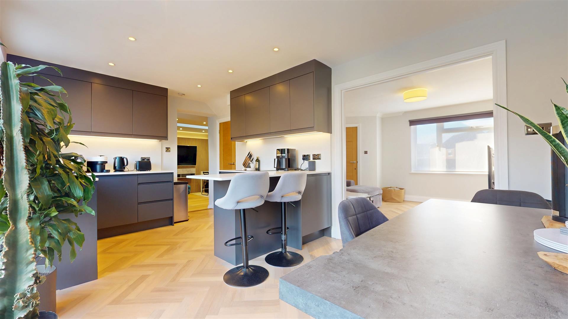 Double glazed window and bifolding doors to rear. Re-fitted range of wall and base units with Quartz worksurfaces, upstands and window ledge. Under cupboard lighting. Electric oven and hob with extractor hood over. Integral fridge, freezer and dishwasher. Sink with mixer tap and engraved drainer. Understairs storage cupboard. LED lighting. Part panelled walls. Vertical radiator. Herringbone Karndean flooring. Arch to second reception/bedroom four