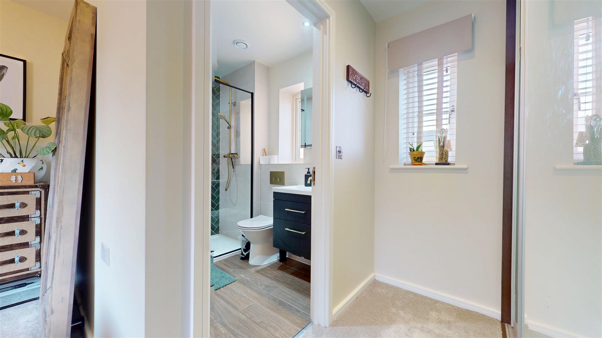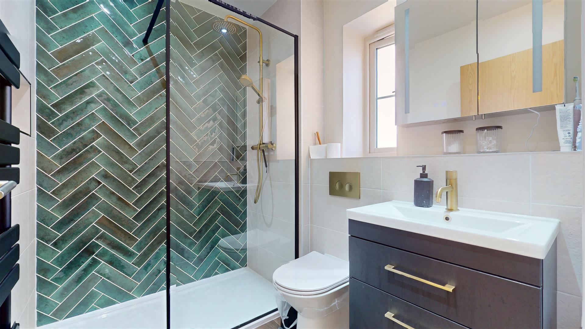 Three piece suite comprising walk in tiled shower cubicle with wall mounted shower, low level wc and wash hand basin Feature radiator. Frosted double glazed window to rear. Skimmed ceiling with inset lighting. Extractor.