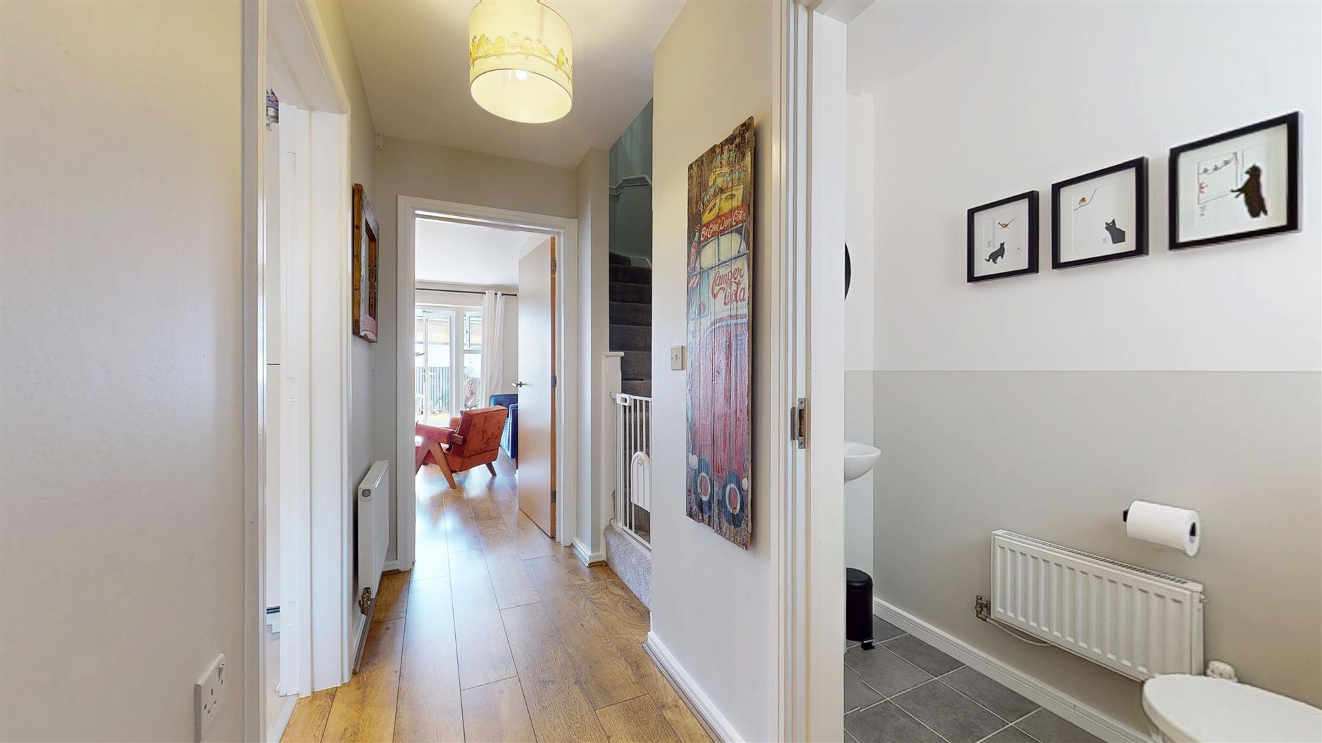Stairs to first floor. Skimmed ceiling. Radiator. Door to lounge/dining room. Door to cloakroom.