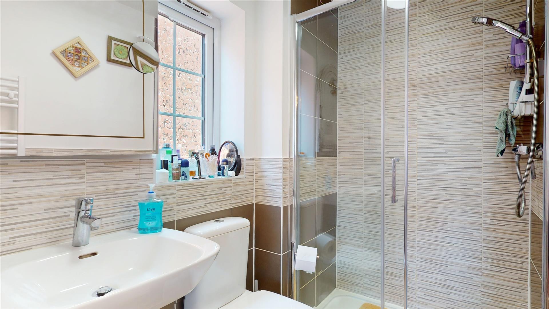 Three piece suite comprising double fully tiled shower cubicle with wall mounted shower, low level wc and wash hand basin. Half tiled walls. Tiled flooring. Shaver point. Extractor. Skimmed ceiling with inset lighting. Frosted double glazed window to side. Heated towel rail.