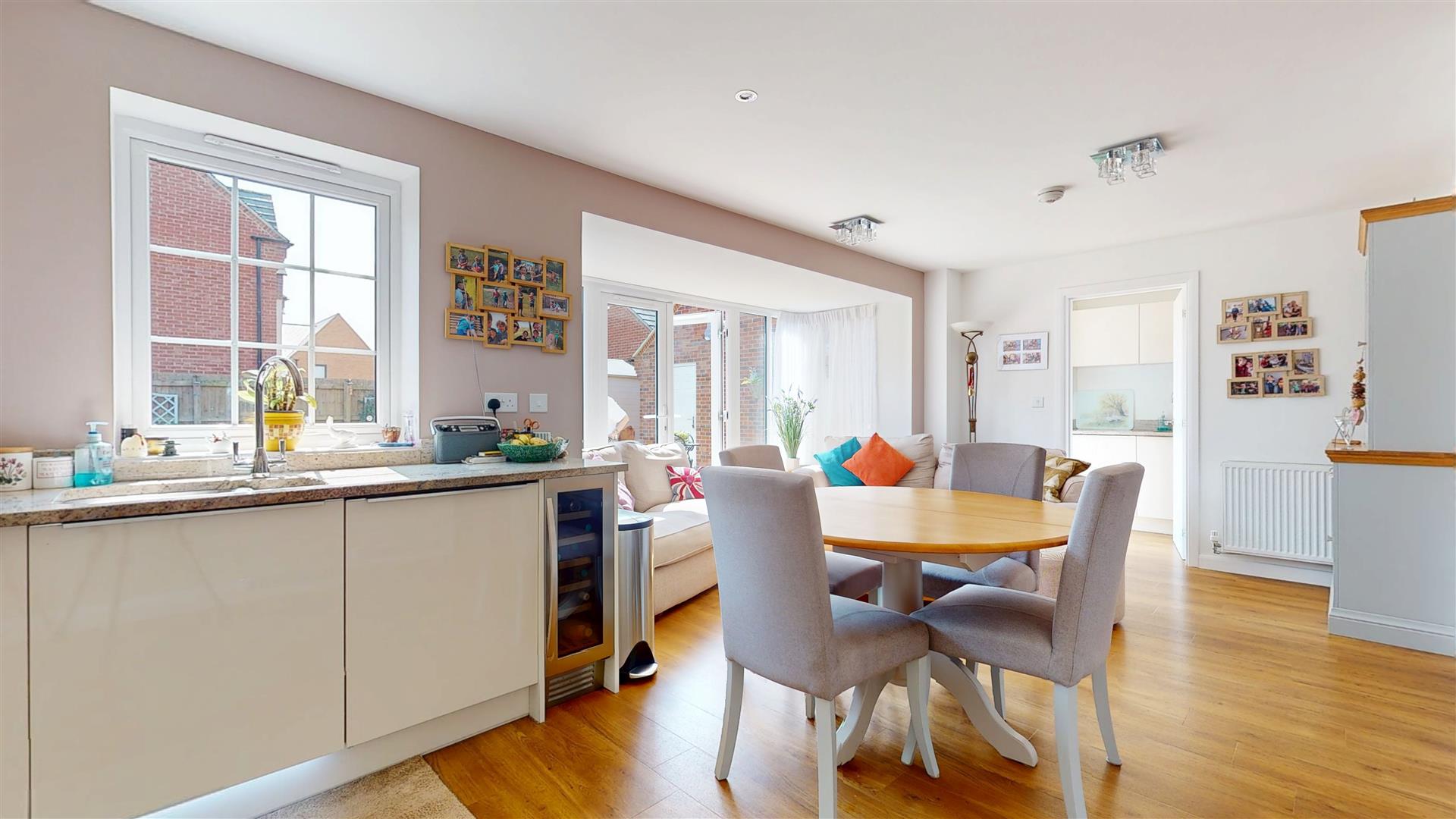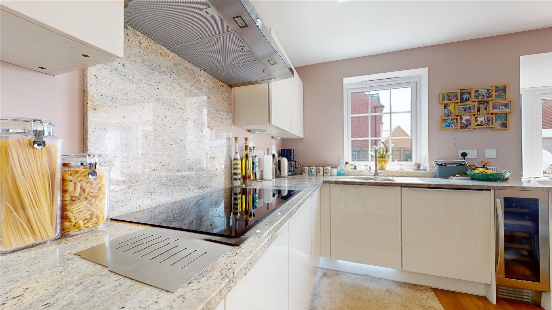 Fitted with a range of soft close wall and base units with Granite worksurfaces incorporating one and half bowl sink drainer and mixer tap. Built in double oven, five ring induction hob and stainless steel extractor. Built in fridge freezer, dishwasher and wine cooler. Double glazed window and French doors to rear with double glazed windows to either side. Radiator. Skimmed ceiling with inset lighting. Under unit lighting. Amtico flooring.