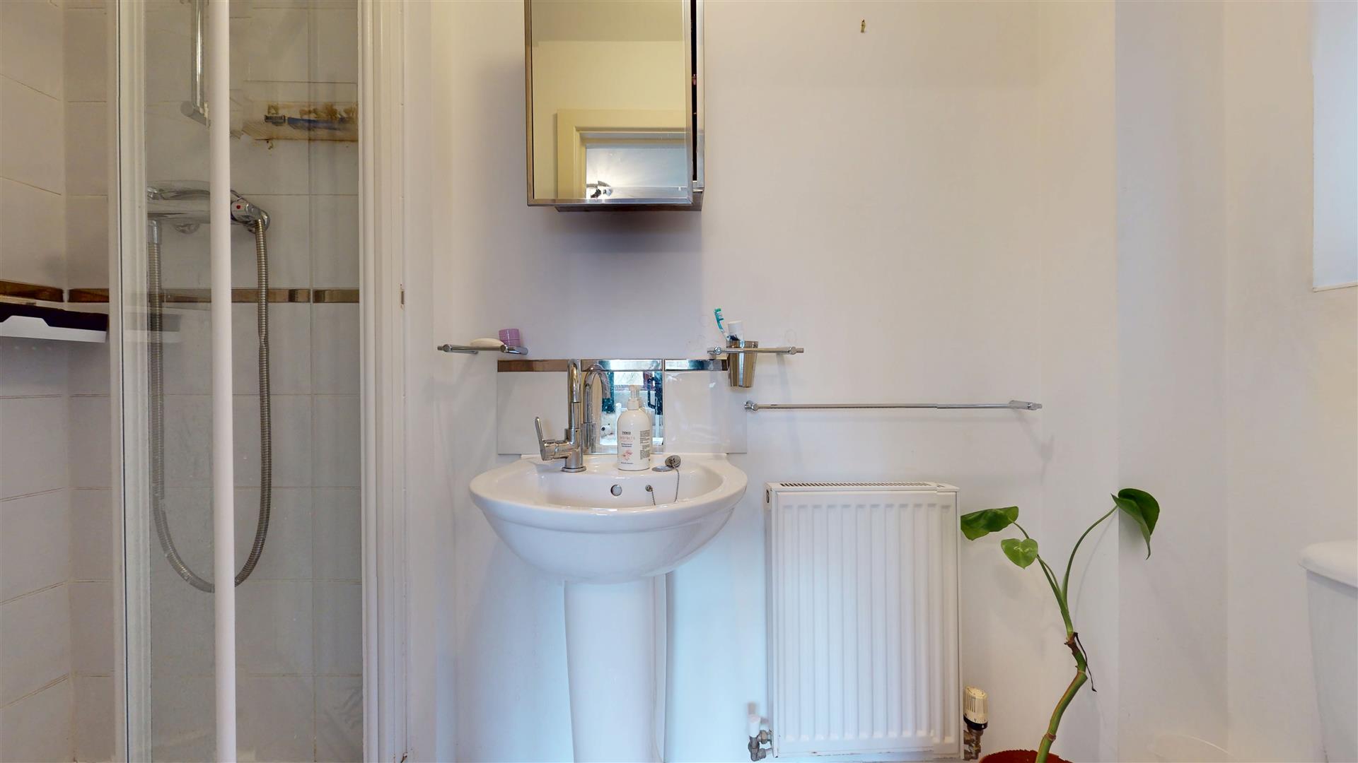 Three piece suite comprising tiled shower cubicle with wall mounted shower, low level wc and wash hand basin. Radiator. Tiled flooring. Extractor. Skimmed ceiling. Frosted double glazed window to side.
