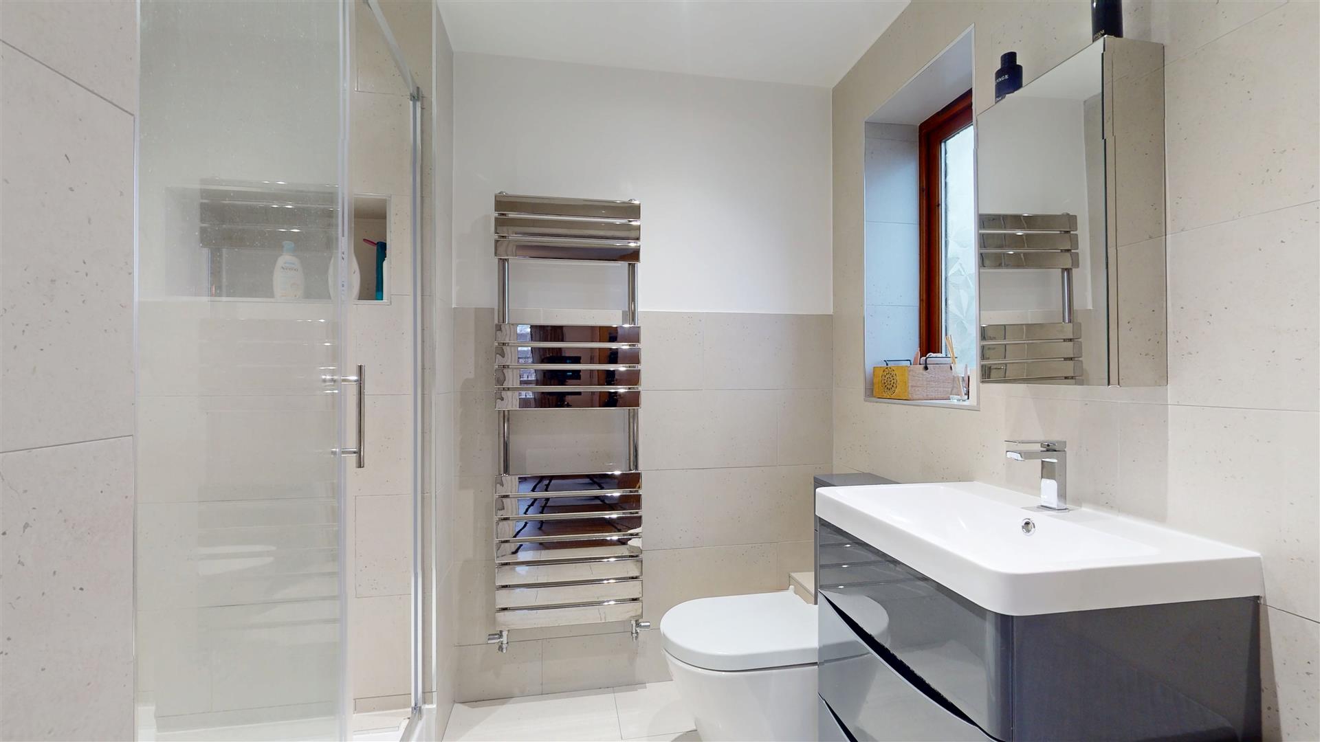 Re-fitted three piece suite comprising double tiled shower cubicle with shower, low level wc and wash hand basin with mixer tap and soft close door surround. Shaver point. Inset lighting. Extractor. Feature radiator. Part tiled walls. Frosted double glazed window to side.