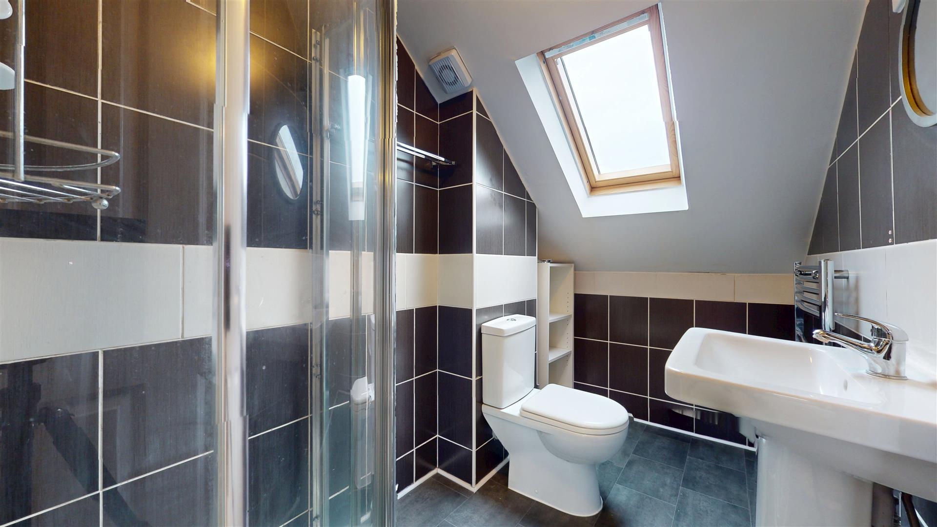 Double glazed sky light window to front. Three piece suite comprising shower cubicle with electric shower, wash hand basin and close coupled wc. Heated towel rail. Extractor fan. Shaver point. Tiled walls.