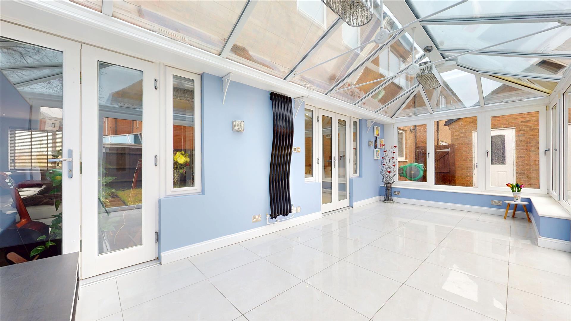 Brick walls and base with double glazed windows to rear and side. Double glazed sliding doors to rear. Glass roof. Wall lights. Underfloor heating. Double glazed French doors to living room and kitchen.