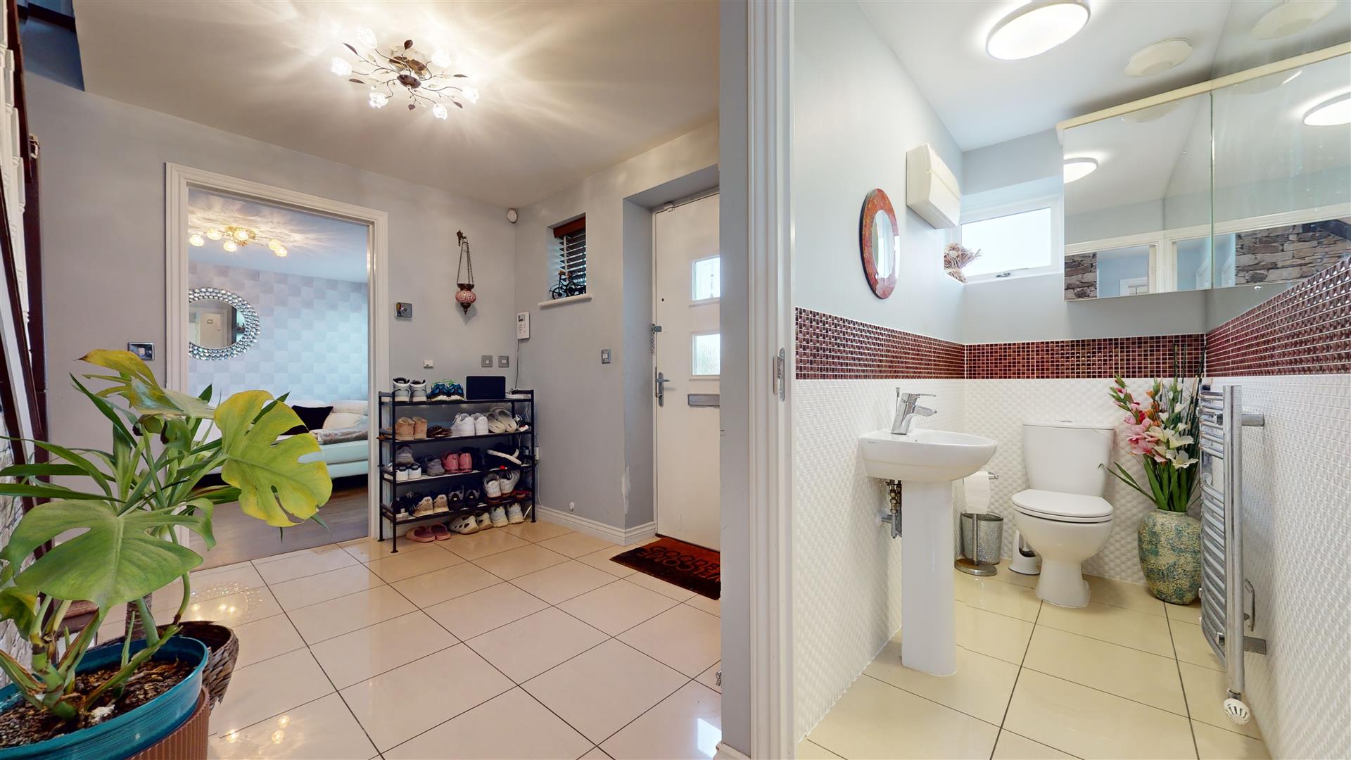 Double glazed window to front and side. Two piece suite comprising close coupled wc and wash hand basin. Heated towel rail. Extractor fan. Tiled flooring. Wall mounted medicine cabinet and fitted mirror.