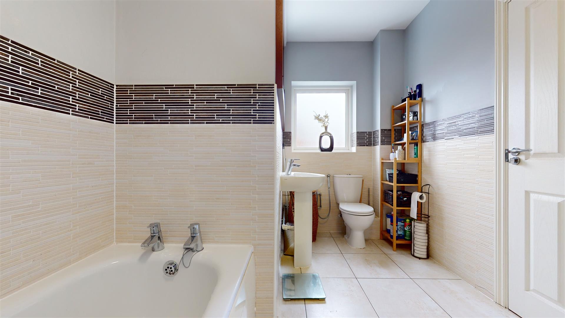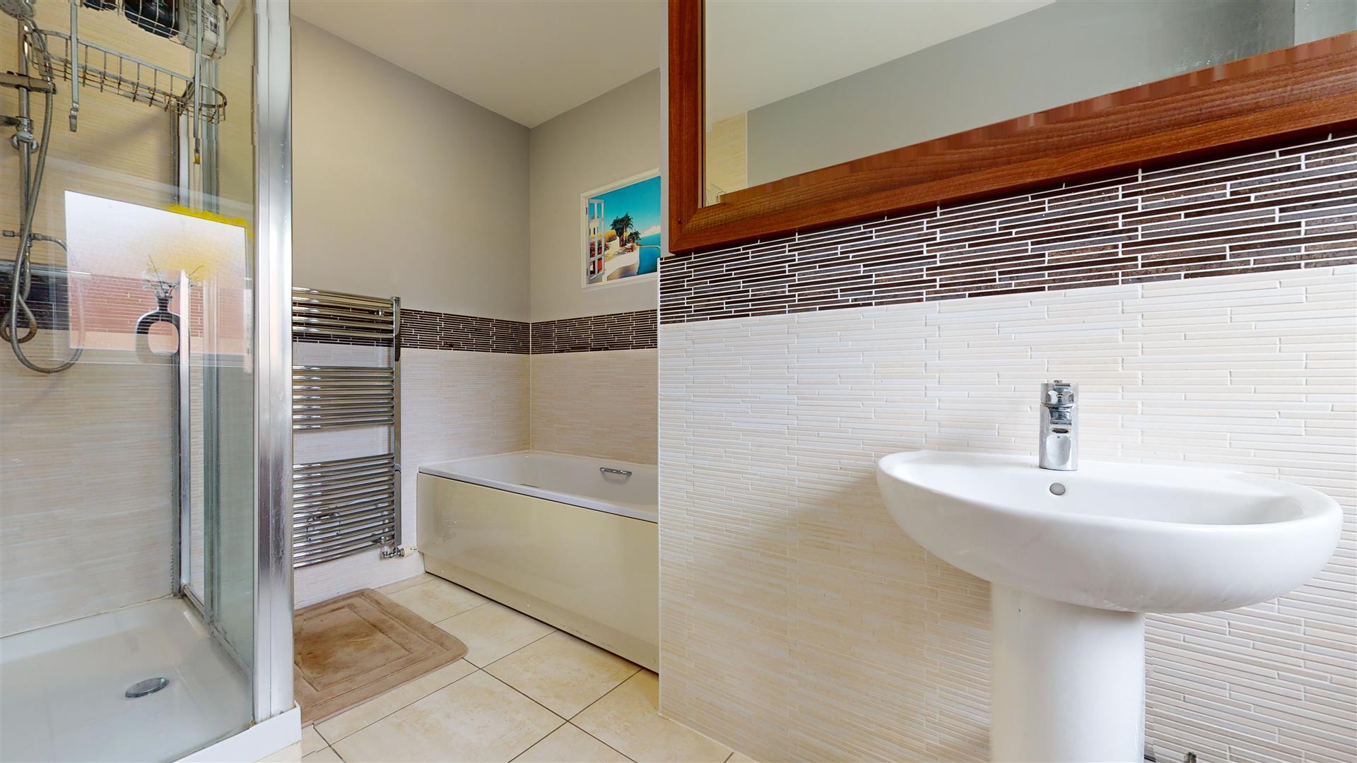 Double glazed obscure window to rear. Four piece suite comprising bath, double shower cubicle with mains shower and rainfall head, close coupled wc and wash hand basin. Heated towel rail. Extractor fan. Tiled flooring.