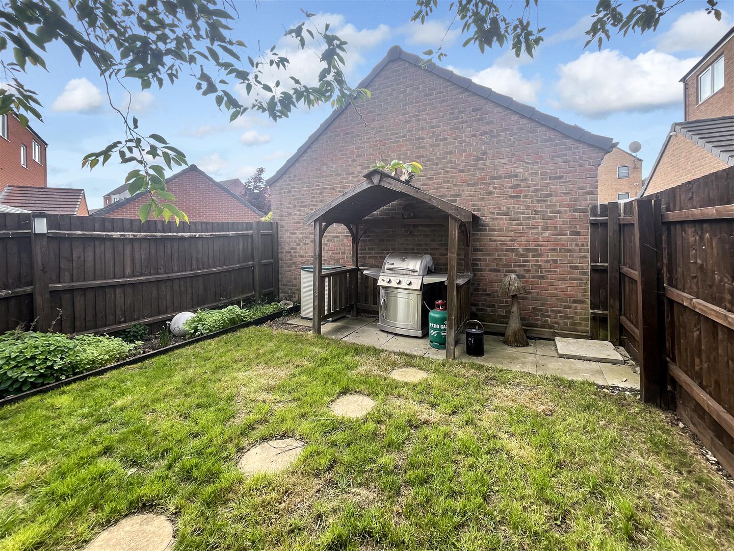 Sandstone patio area leading to two lawned areas with flower beds and borders with small trees and plants. Timber shed. Garden lighting. Outside power and tap. Gated access to side leading to driveway.