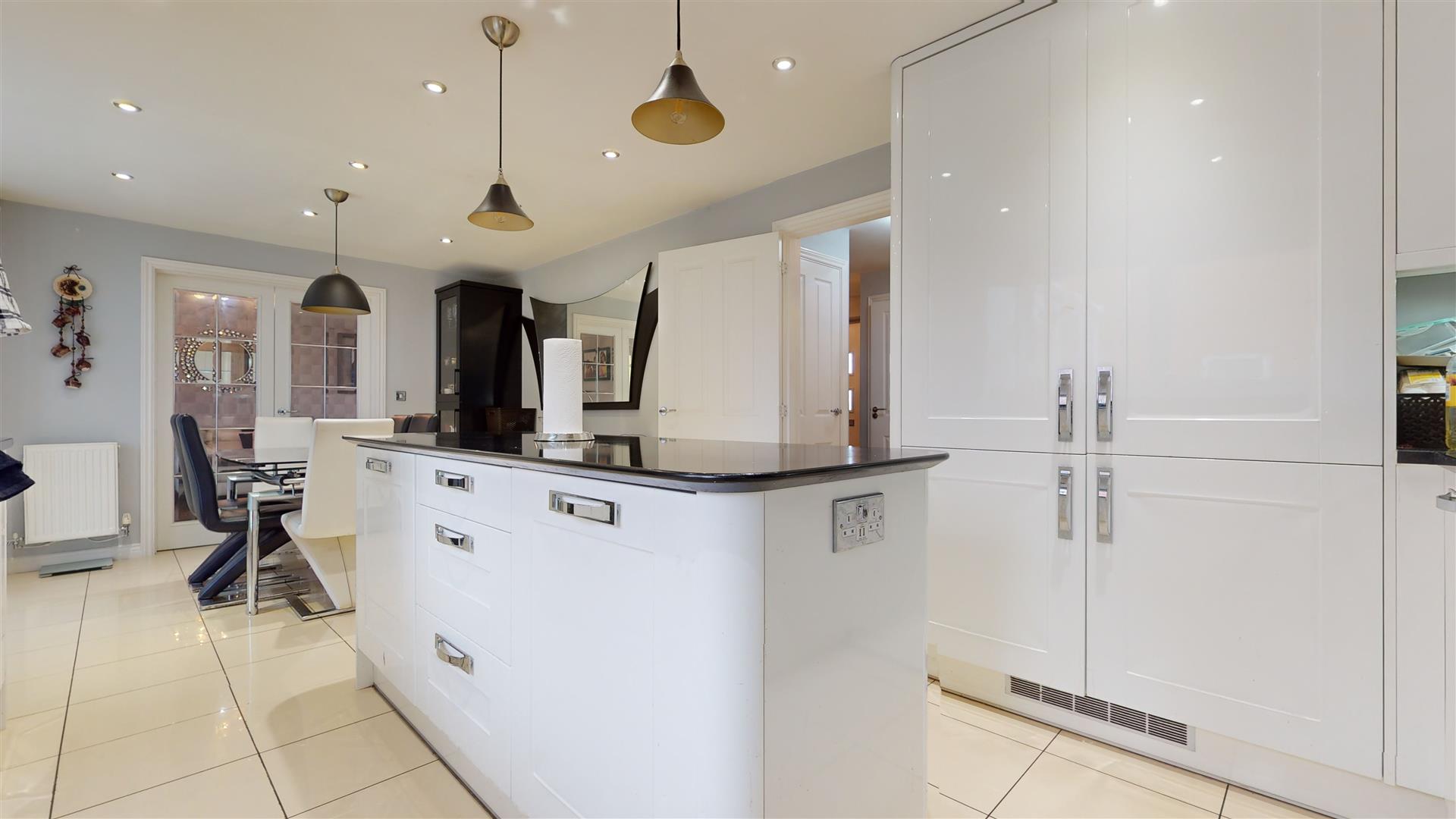 Double glazed windows and French doors to rear. Re-fitted with a range of wall and base units with Granite worksurfaces with stainless steel sink and drainer. Double electric oven. five ring gas hob and extractor hood. Integral dishwasher, fridge and freezer. Wall mounted central heating boiler. Central island with base units and Granite worksufaces with power points. Radiator. LED and drop lighting. Tiled flooring.