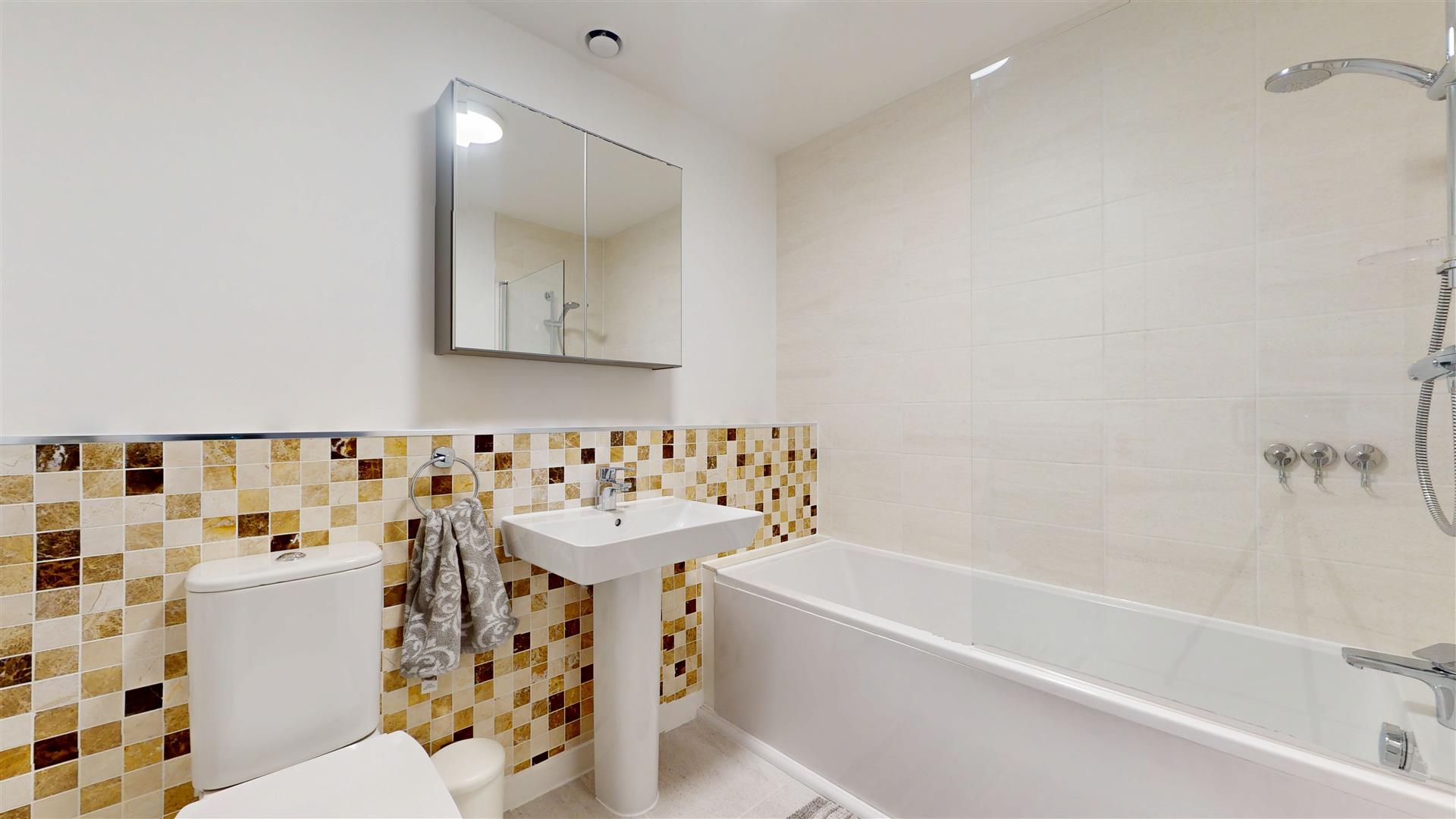 Three piece suite comprising bath with mixer tap, mans shower and recessed pipework, fitted glass shower screen, wash hand basin and close coupled wc. Heated towel rail. Air filtration system. Tiled flooring. Wall mounted medicine cabinet.