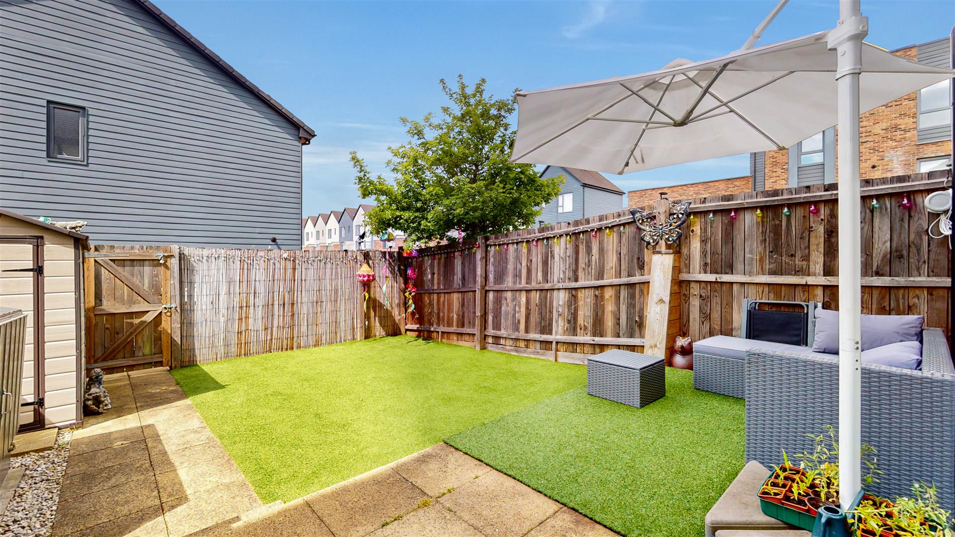 Rear width patio area with path to side leading to rear access gate and artificial lawn. Outside tap.