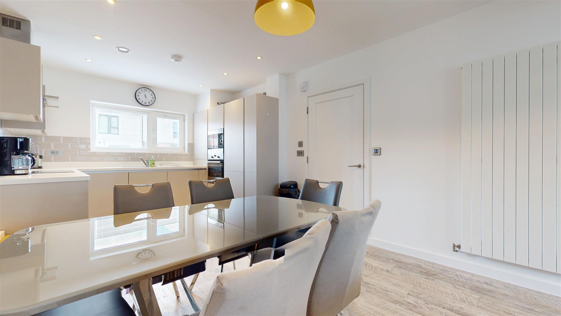 Triple glazed window to front with inset blinds. Fitted wall and base units with worksurfaces. One and half bowl sink drainer unit Electric oven. fitted combi microwave, four ring induction hob with extractor over. Integral dishwasher, washing machine and fridge freezer. LED lighting. Vertical radiator. Air filtration system. Wall mounted boiler.