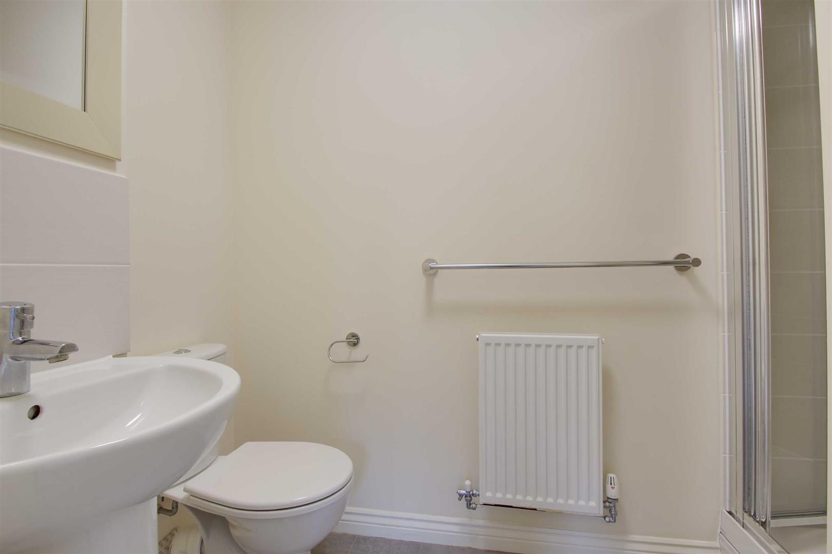 Frosted double glazed window to front aspect. Three piece suite comprising panelled bath with shower above and shower screen, low level wc and wash hand basin. Tiled splash backs. Radiator.