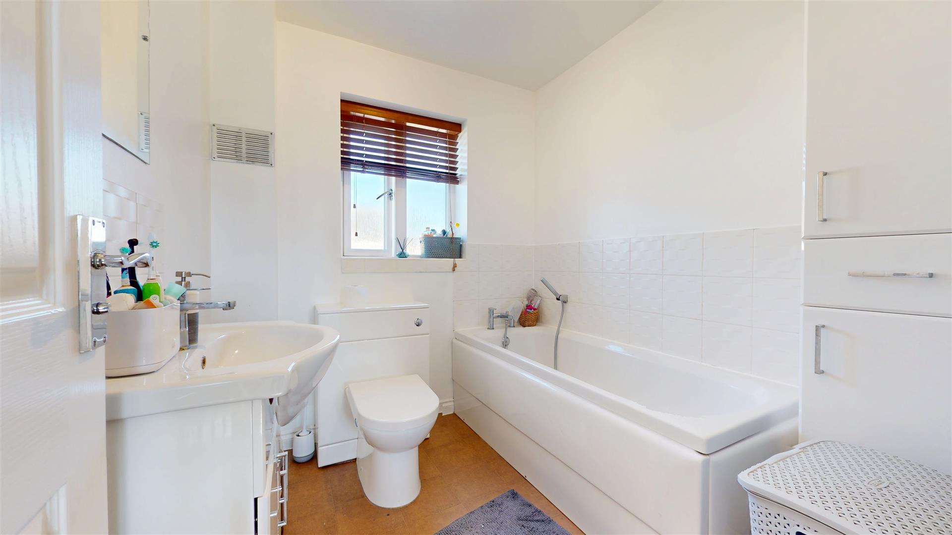 Double glazed obscure window to front. Three piece suite comprising bath with shower attachment, wash hand basin in vanity surround and close coupled wc. Extractor fan. Heated towel rail.