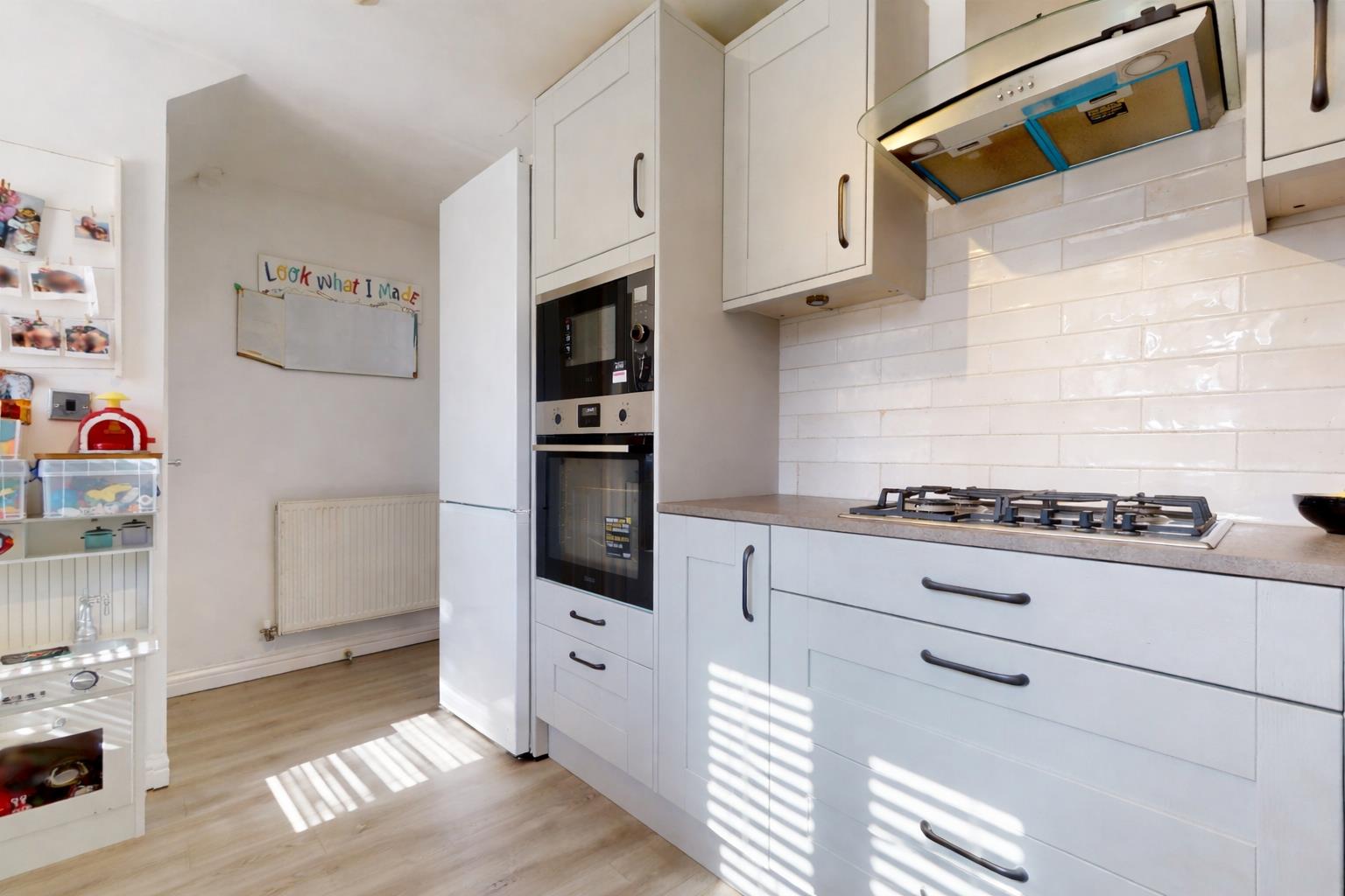 Double glazed window and door to rear. Re-fitted range of wall and base units with worksurfaces incorporating sink drainer unit. Electric oven and microwave and four ring gas hob with extractor hood over. Space for fridge freezer. Integral dishwasher and washing machine. Under cupboard lighting. Radiator. Pantry cupboard with media connections for speakers.