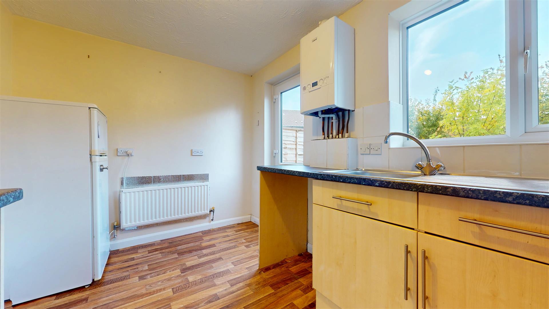 Double glazed window to rear aspect and double glazed door to the rear. Kitchen fitted with a range of wall and base units. Work surfaces incorporating stainless steel sink and drainer with mixer tap. Integrated oven with four ring gas hob and extractor over. Plumbing for washing machine. Space for fridge freezer. Splash back tiles. Radiator.