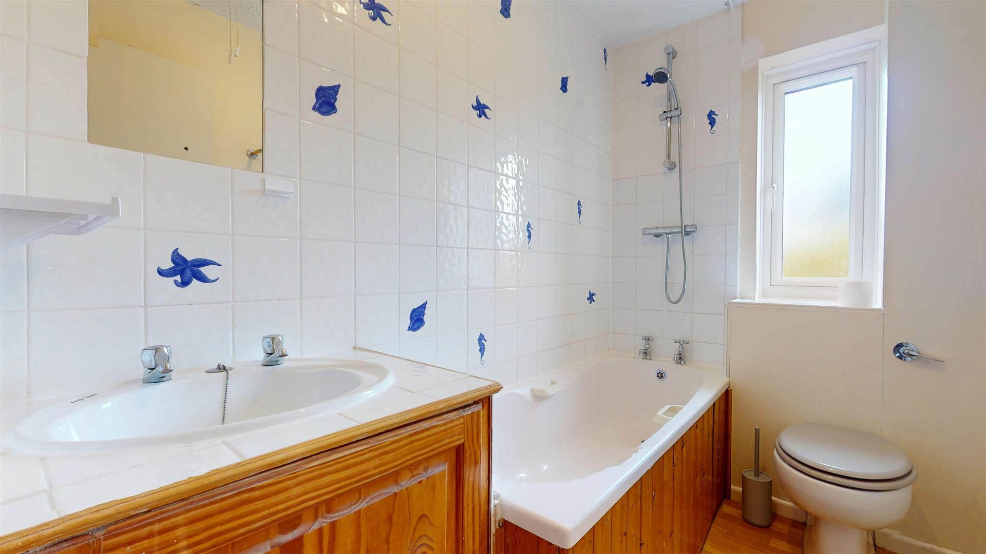 Frosted double glazed window to the rear aspecr. Panelled bath with shower over. Low level wc, wash hand basin with cupboard surround. Part tiled walls. Radiator.