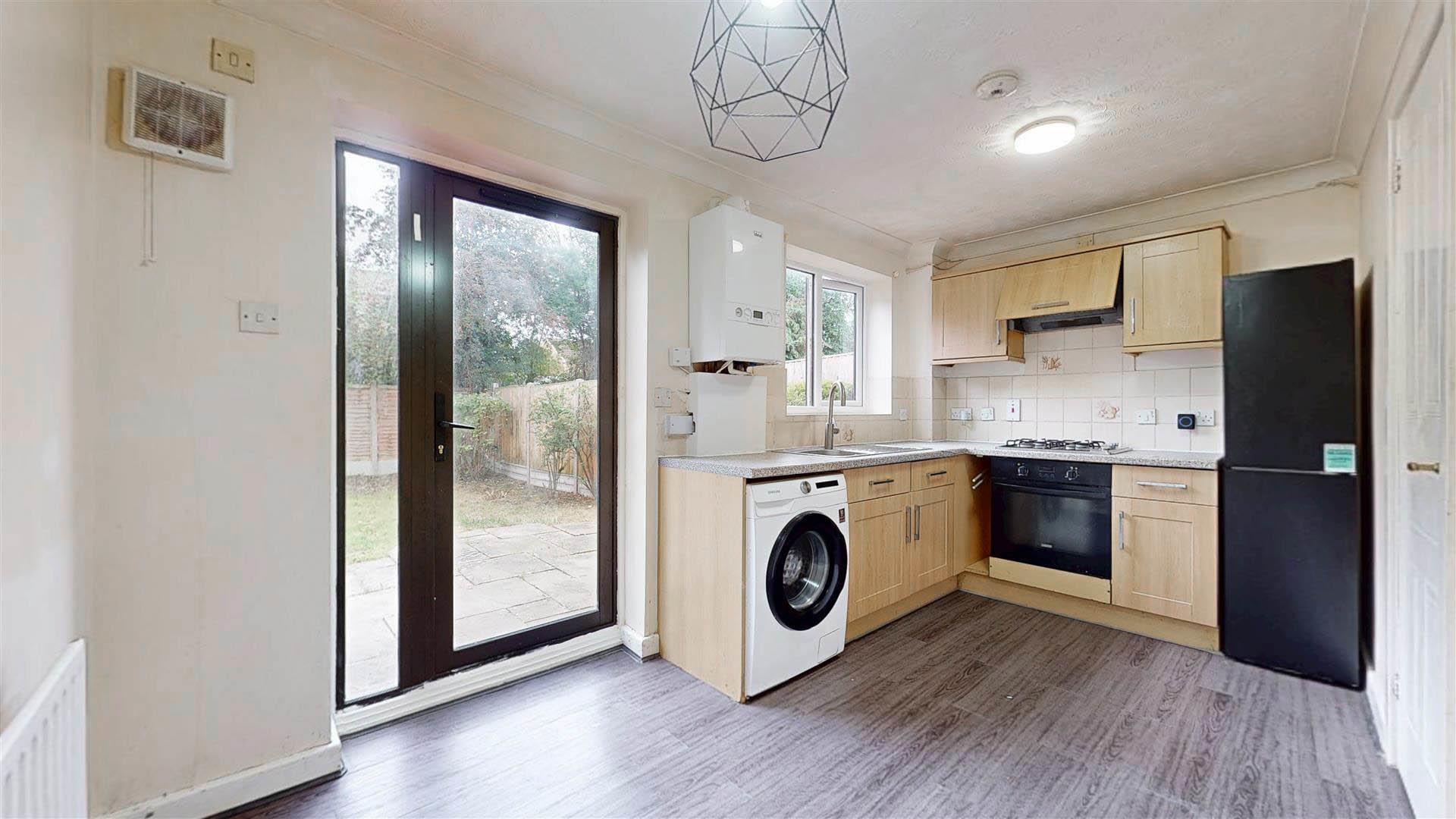 Fitted kitchen fitted with a range of wall and base units. Work surfaces incorporating a stainless steel sink and drainer with mixer tap. Built in oven, four ring gas hob with extractor. Plumbing for washing machine, space for fridge freezer. Wall mounted boiler. Double glazed window to the rear. Splash back tiles. Double glazed door to the rear, Radiator. Coving to a textured ceiling.