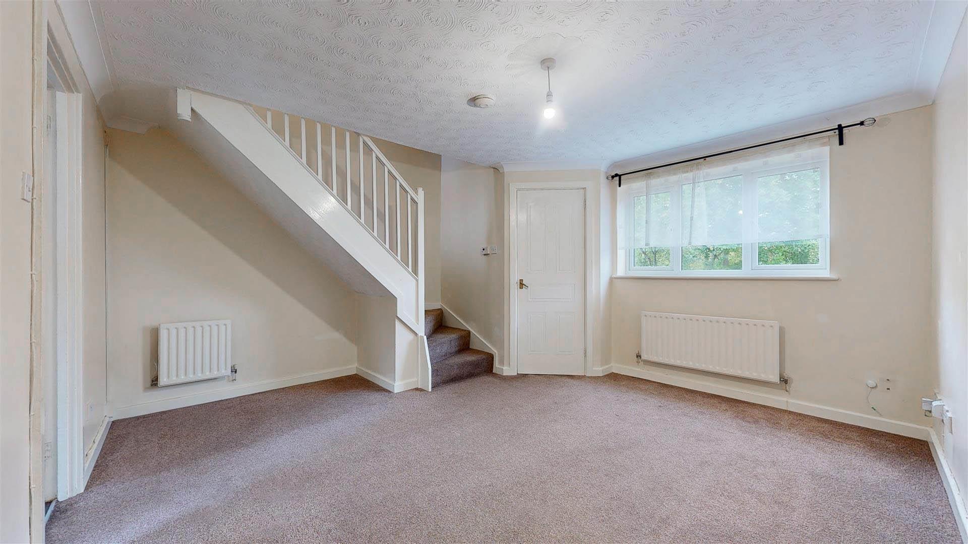 Measurements include under stair recess, Stairs to first floor. Double glazed window to the front. two radiators. Coving to textured ceiling. Door to kitchen dining room.