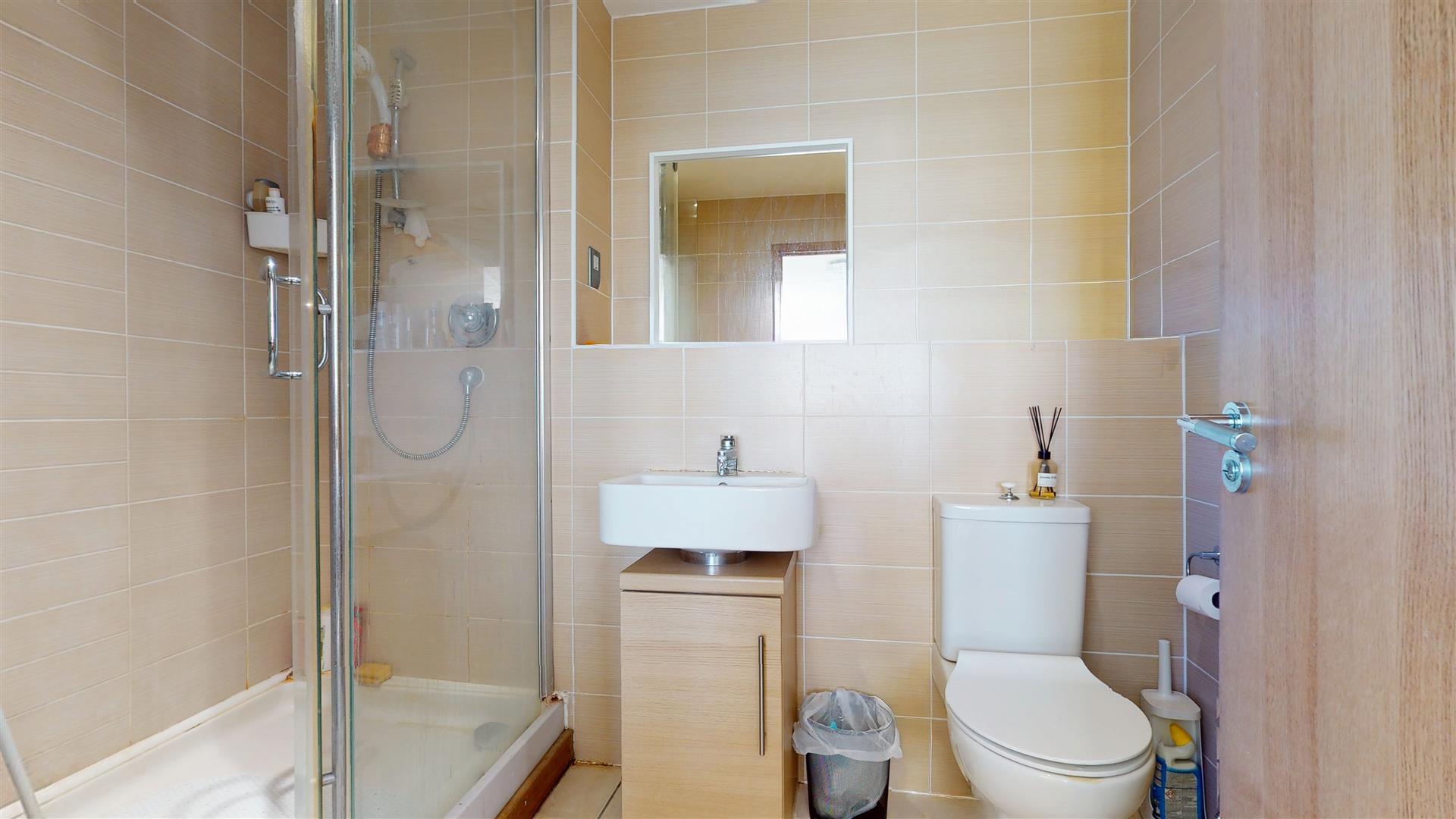 Double shower cubicle with mains shower, wash hand basin and close coupled wc. Extractor fan. Shaver point. Heated towel rail. Tiled walls and flooring.