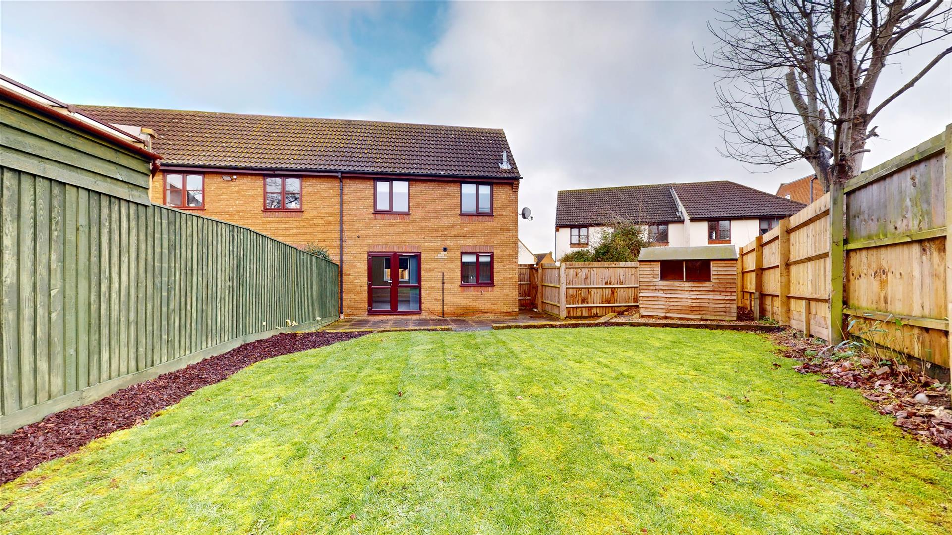 Laid to lawn with rear width patio area, flower beds and border. Timber shed. Gated access to front. Outside tap.