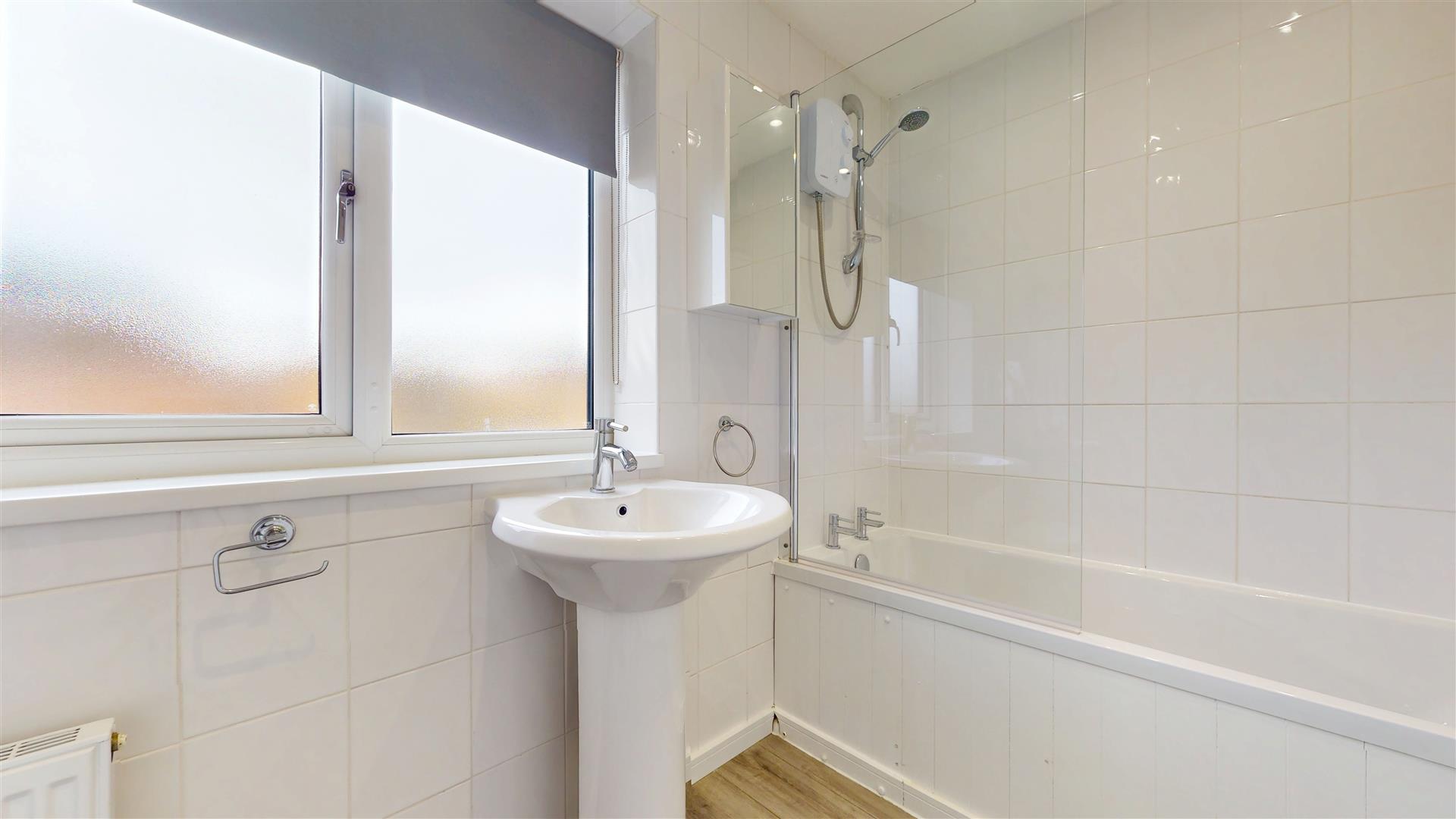 Double glazed obscure window to rear. Three piece suite comprising bath with electric shower and glass screen, wash hand basin and close coupled wc. Radiator. LED lighting. Airing cupboard.