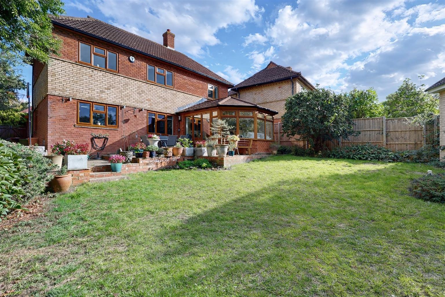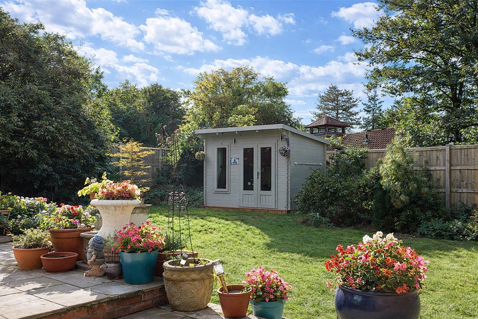 Secluded rear garden mainly laid to lawn. Patio area. Wooden fence panel surround. Gated access. Outside tap. Service door leading to double garage. Summerhouse / garden office with power and light.