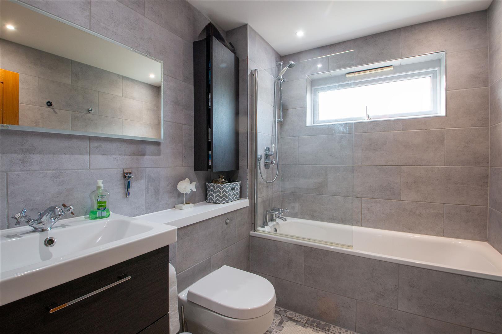 Double glazed obscure window to rear. Fitted modern suite with bath with mains shower and screen, wash hand basin in vanity unit and close coupled wc. Tiled walls and flooring. Heated towel rail.