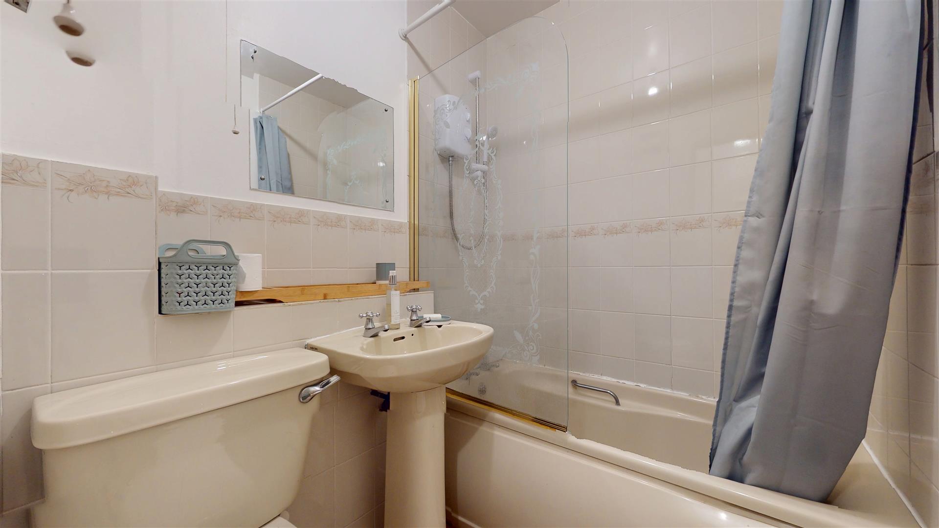 Three piece suite comprising bath with electric shower over, wash hand basin and close coupled wc. Electric heater. Extractor fan.
