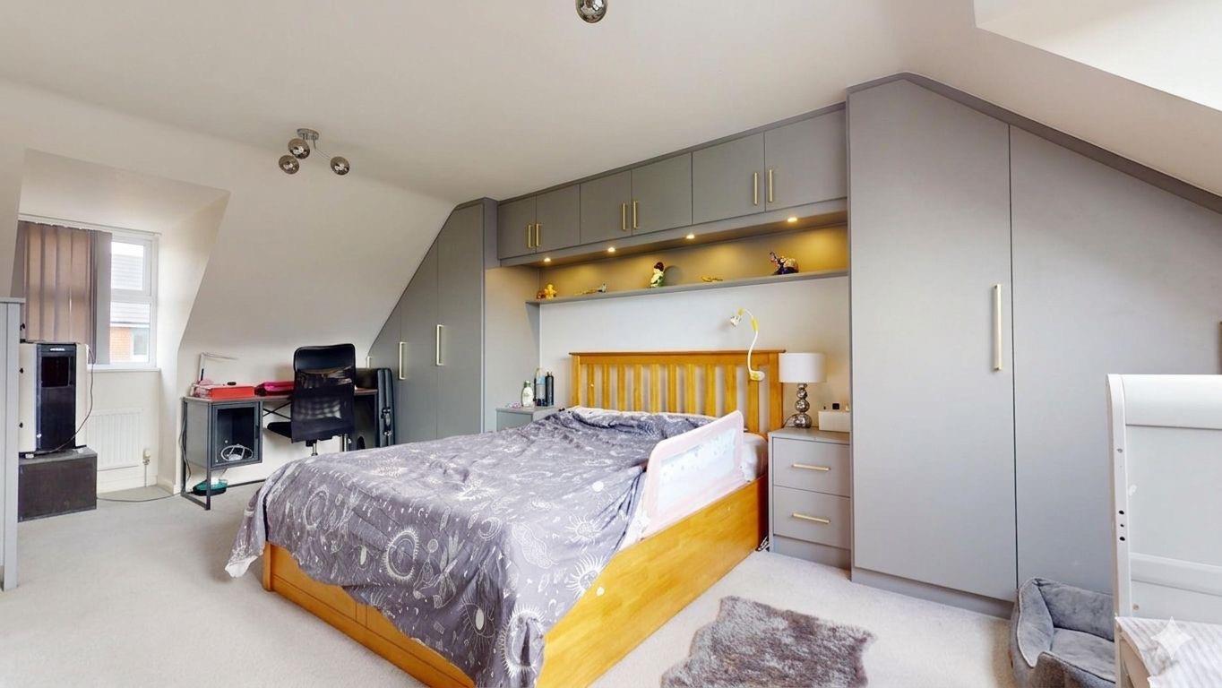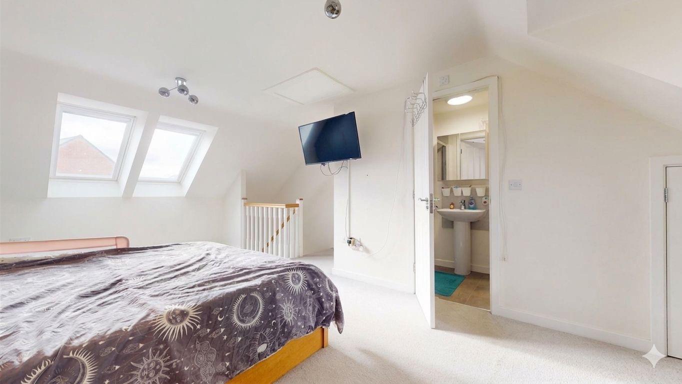 Double glazed window to front. Two double glazed sky light windows with fitted blinds to rear. Two radiators. Fitted wardrobes, chest of drawers and over head storage cupboards. Access to boarded loft space via fitted loft ladder. Door to ensuite.