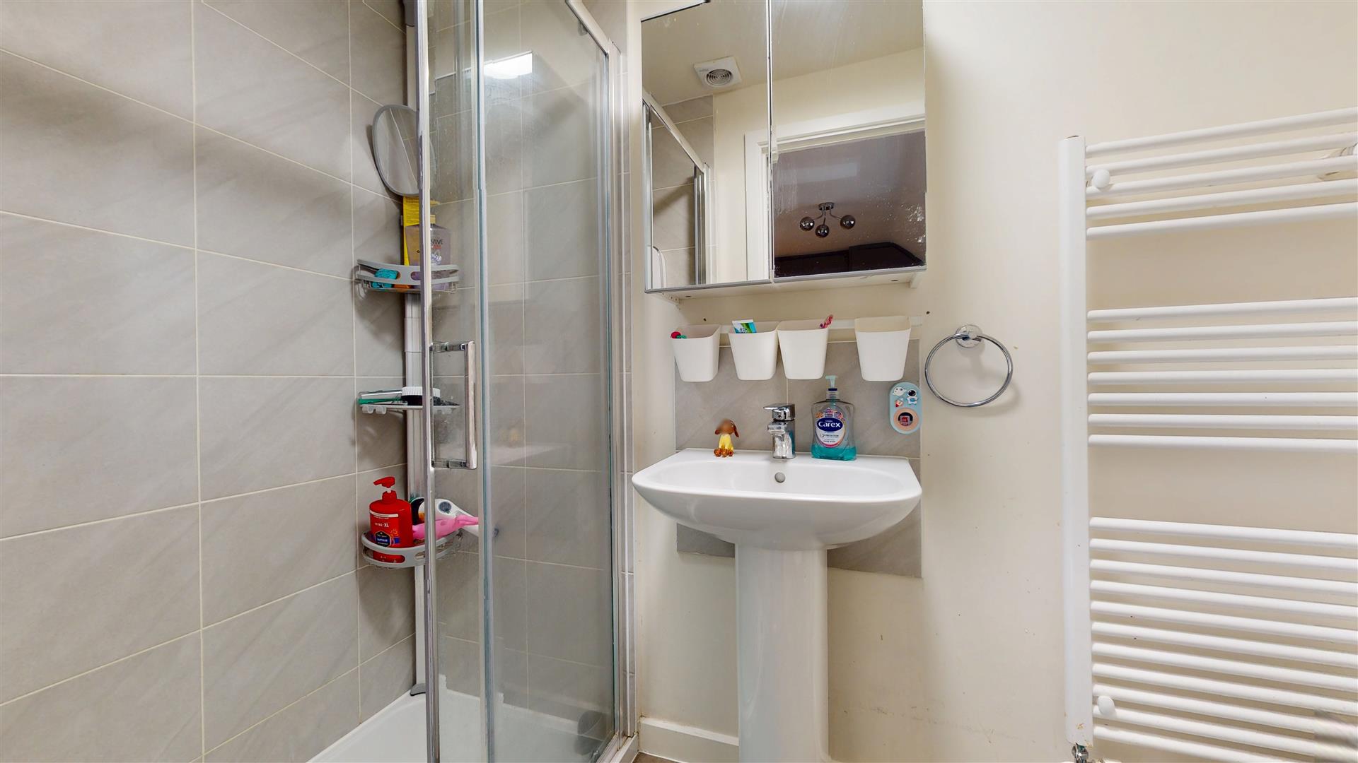 Double shower cubicle with electric shower, wash hand basin and close coupled wc. Shaver point. Heated towel rail. Extractor fan.
