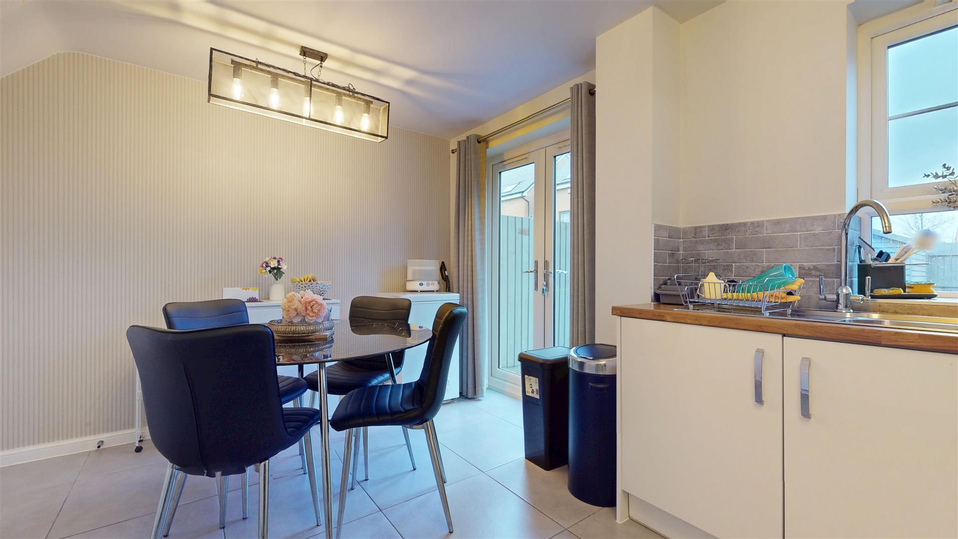 Double glazed window to rear and double glazed French doors to rear. Fitted with a range of wall and base units with worksurfaces. Stainless steel sink drainer and mixer tap. Electric oven. four ring gas hob and extractor hood. Integral fridge freezer, washing machine and dishwasher. Wall mounted combination boiler. Under cupboard lighting. Radiator. Tiled flooring Understairs storage cupboard with internet point.